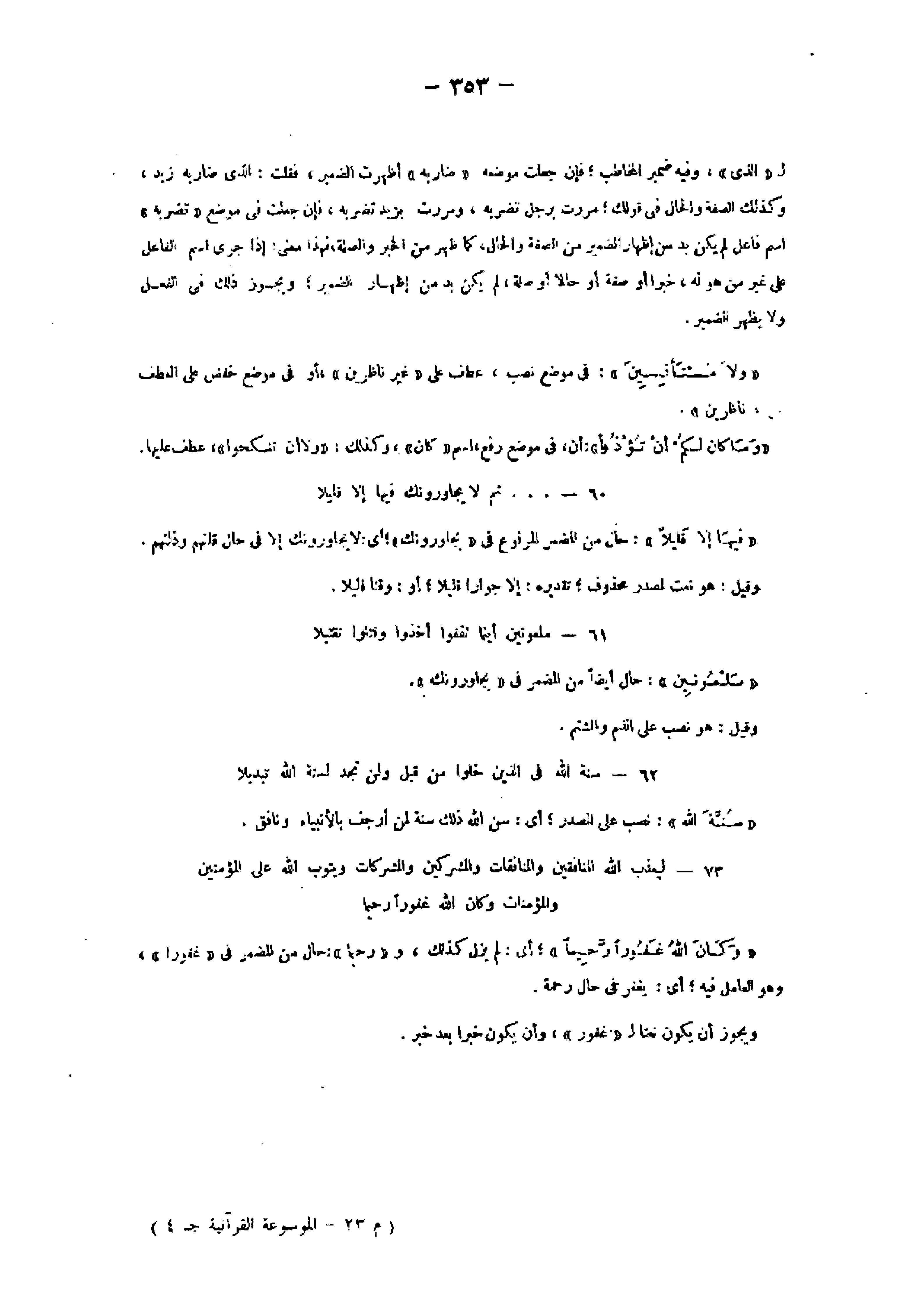62- سُنَّةَ اللَّهِ فِي الَّذِينَ خَلَوْا مِنْ قَبْلُ وَلَنْ تَجِدَ لِسُنَّةِ اللَّهِ تَبْدِيلًا «سنّة الله» : نصب على المصدر أي: سن الله ذلك سنة لمن أرجف بالأنبياء ونافق.