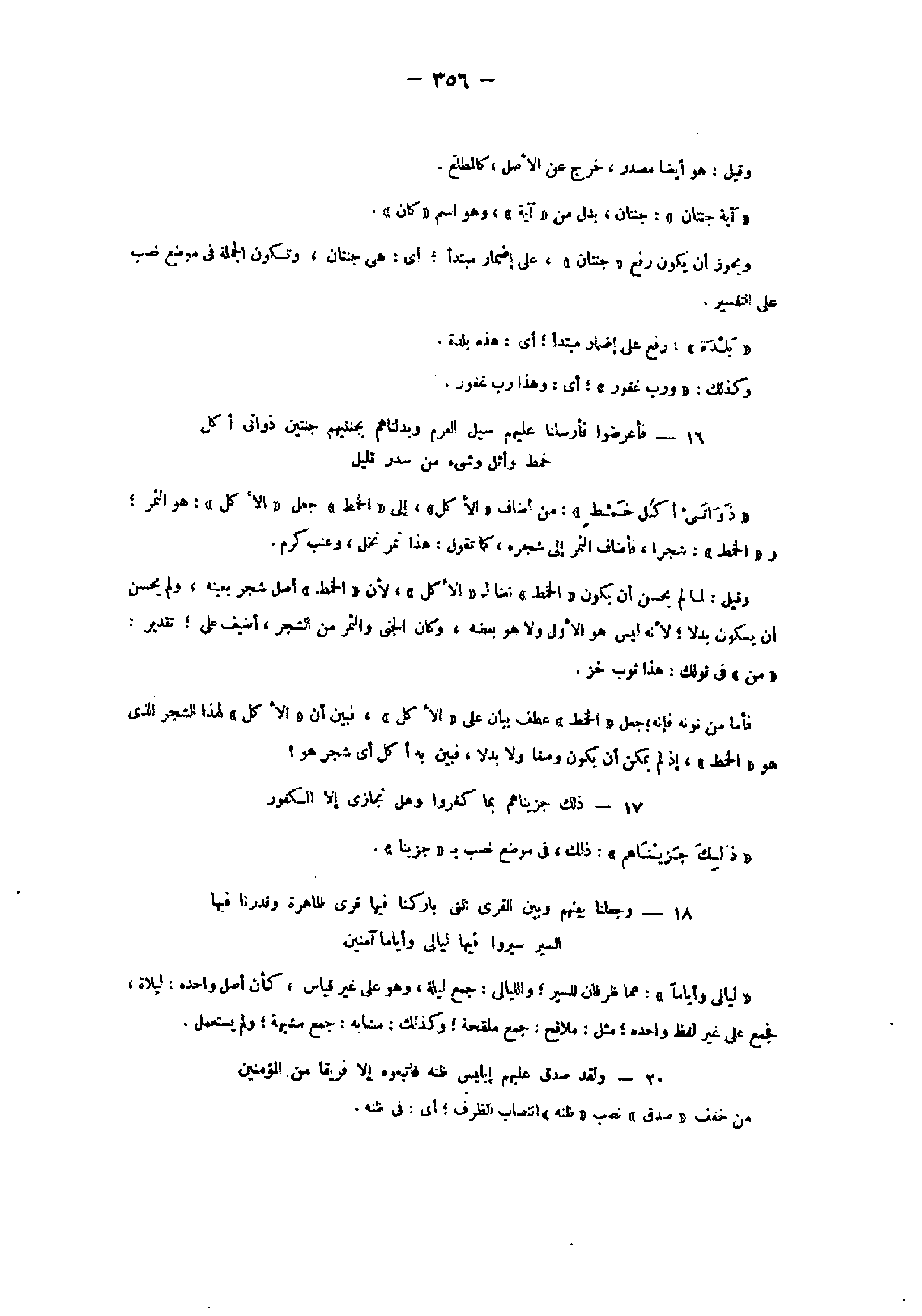 16- فَأَعْرَضُوا فَأَرْسَلْنا عَلَيْهِمْ سَيْلَ الْعَرِمِ وَبَدَّلْناهُمْ بِجَنَّتَيْهِمْ جَنَّتَيْنِ ذَواتَيْ أُكُلٍ خَمْطٍ وَأَثْلٍ وَشَيْءٍ مِنْ سِدْرٍ قَلِيلٍ «ذواتى أكل خمط» : من أضاف «الأكل» ، إلى «الخمط» جعل «الأكل» : هو الثمر و «الخمط» : شجرا، فأضاف الثمر إلى شجره، كما تقول: هذا تمر نخل، وعنب كرم.