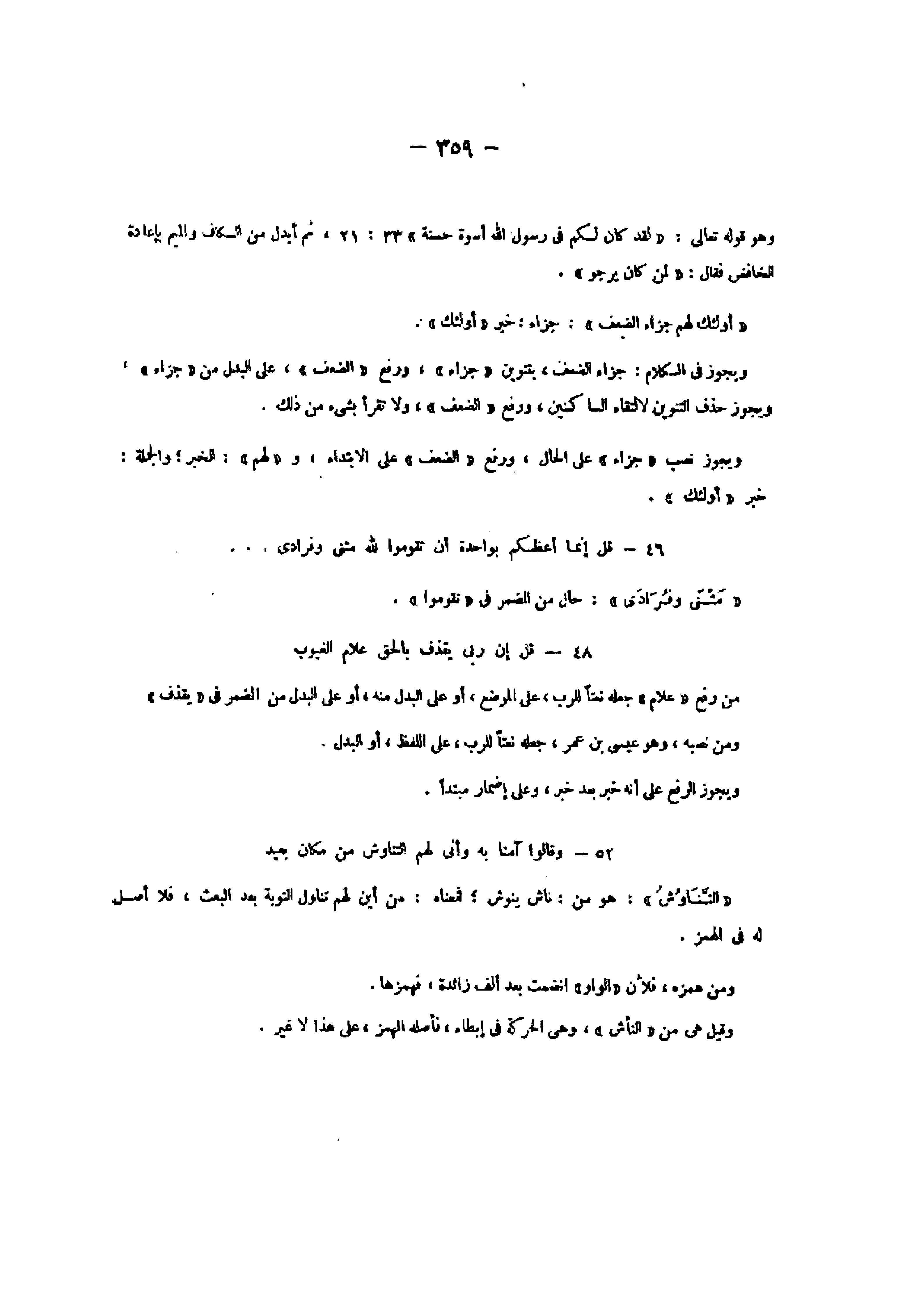 52- وَقالُوا آمَنَّا بِهِ وَأَنَّى لَهُمُ التَّناوُشُ مِنْ مَكانٍ بَعِيدٍ «التّناوش» : هو من: ناش ينوش فمعناه: من أين لهم تناول التوبة بعد البعث، فلا أصل له فى الهمز.