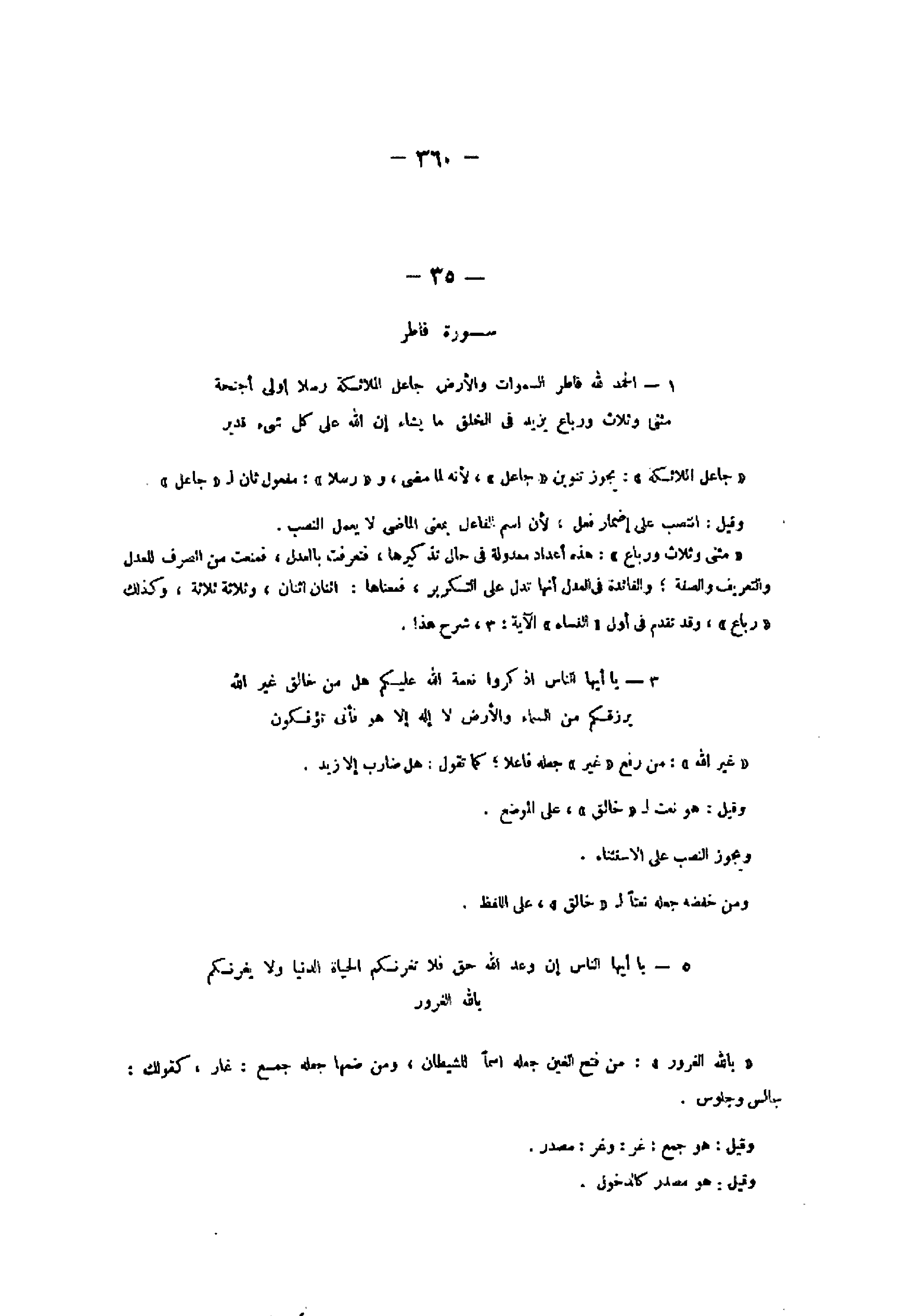 1- الْحَمْدُ لِلَّهِ فاطِرِ السَّماواتِ وَالْأَرْضِ جاعِلِ الْمَلائِكَةِ رُسُلًا أُولِي أَجْنِحَةٍ مَثْنى وَثُلاثَ وَرُباعَ يَزِيدُ فِي الْخَلْقِ ما يَشاءُ إِنَّ اللَّهَ عَلى كُلِّ شَيْءٍ قَدِيرٌ «جاعل الملائكة» : يجوز تنوين «جاعل» ، لأنه لما مضى، و «رسلا» : مفعول ثان ل «جاعل» .