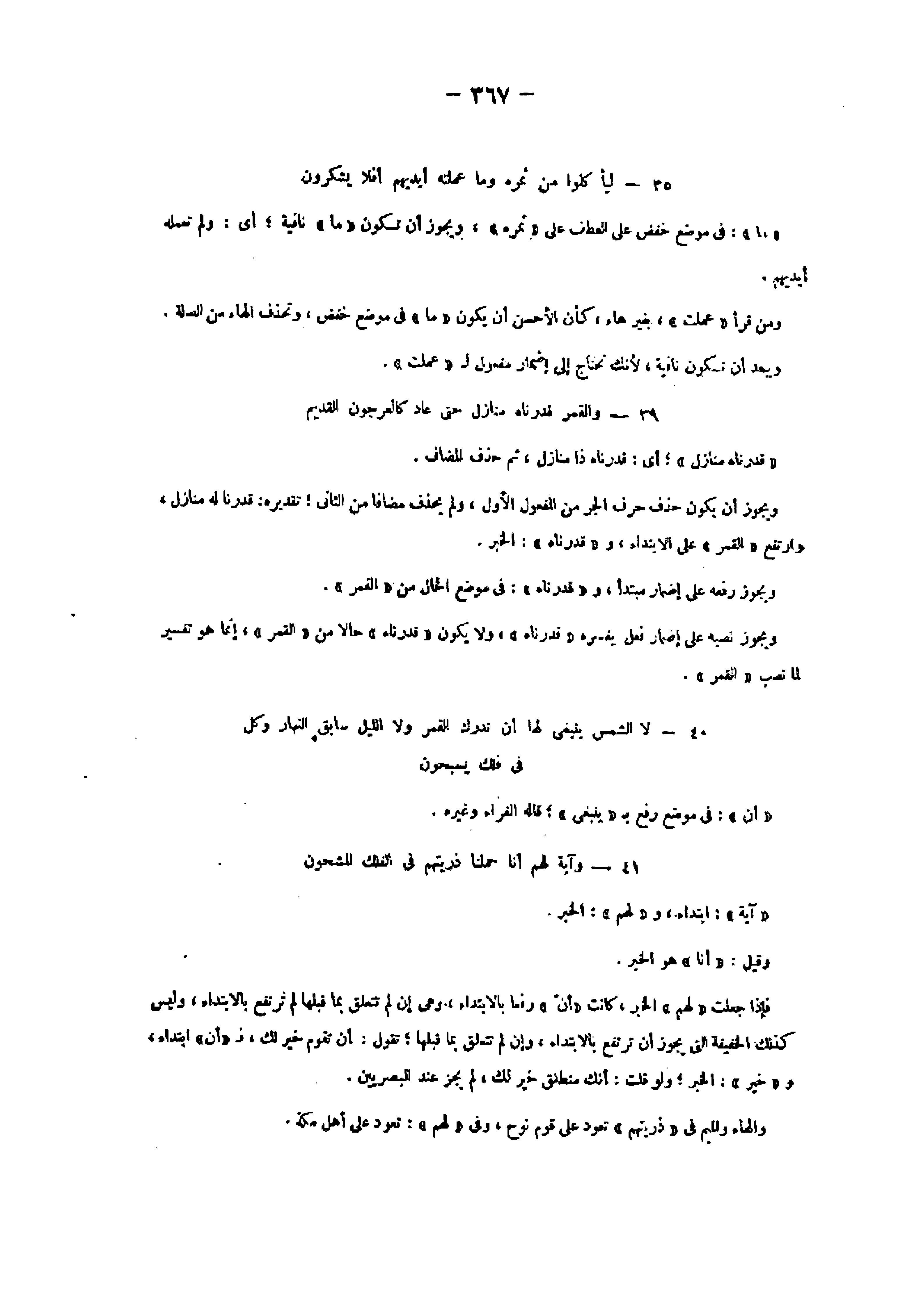 35- لِيَأْكُلُوا مِنْ ثَمَرِهِ وَما عَمِلَتْهُ أَيْدِيهِمْ أَفَلا يَشْكُرُونَ «ما» : فى موضع خفض على العطف على «ثمره» ، ويجوز أن تكون «ما» نافية أي: ولم تعمله أيديهم.