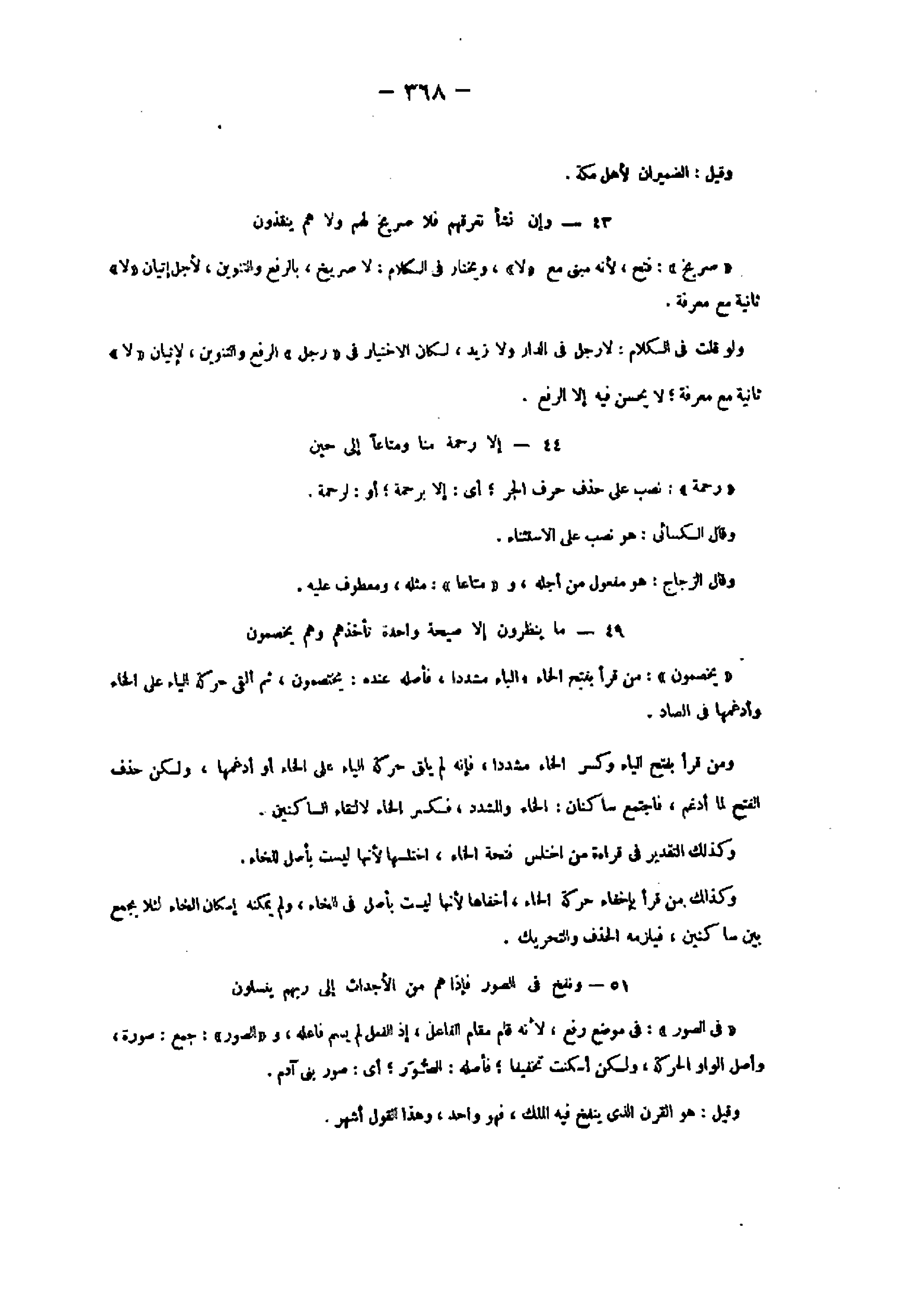 43- وَإِنْ نَشَأْ نُغْرِقْهُمْ فَلا صَرِيخَ لَهُمْ وَلا هُمْ يُنْقَذُونَ «صريخ» : فتح، لأنه مبنى مع «لا» ، ويختار فى الكلام: لا صريخ، بالرفع والتنوين، لأجل إتيان «لا» ثانية مع معرفة.