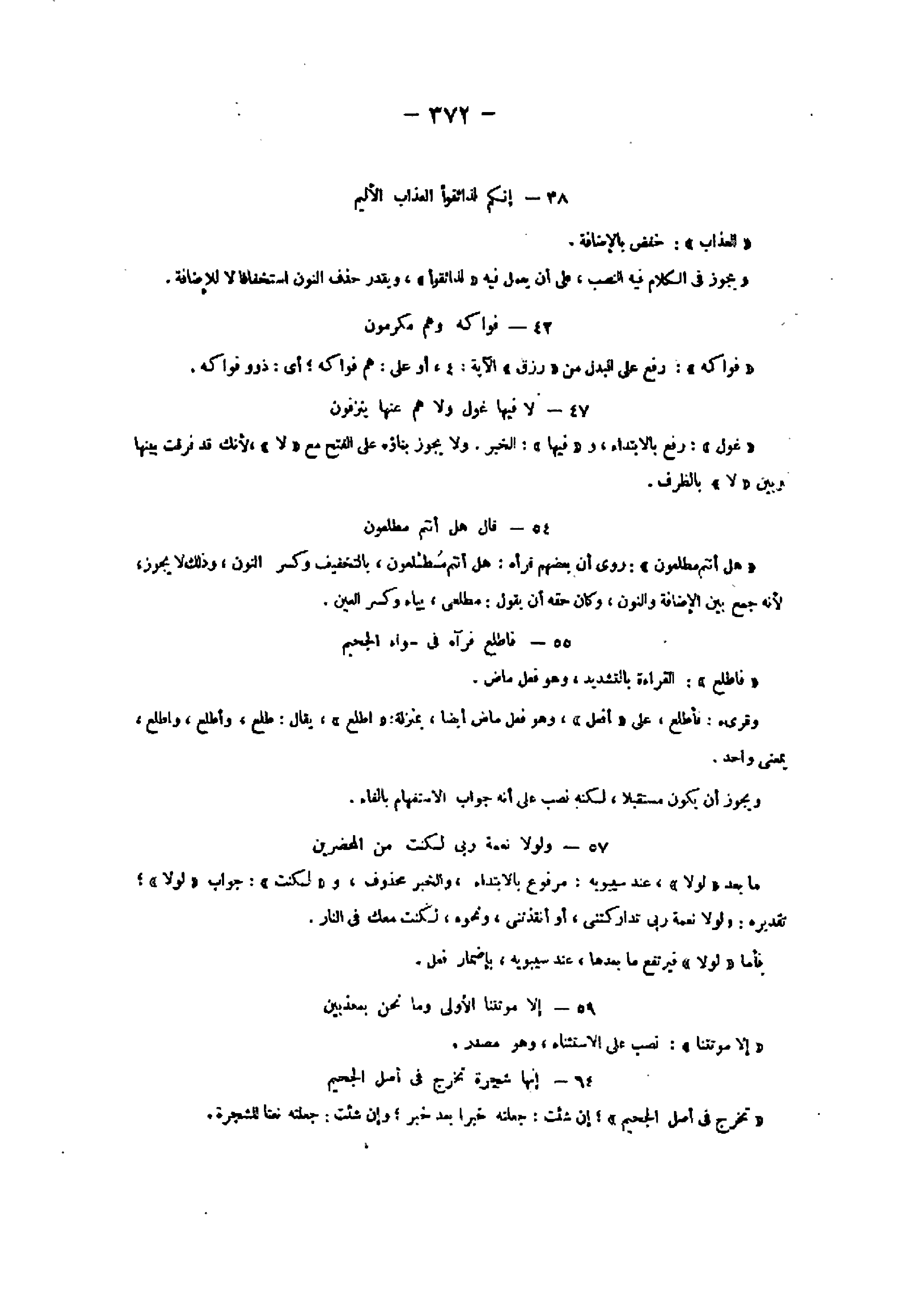 54- قالَ هَلْ أَنْتُمْ مُطَّلِعُونَ «هل أنتم مطلعون» : روى أن بعضهم قرأه: هل أنتم مطلعون، بالتخفيف وكسر النون، وذلك لا يجوز، لأنه جمع بين الإضافة والنون، وكان حقه أن يقول: مطلعى، بياء وكسر العين.