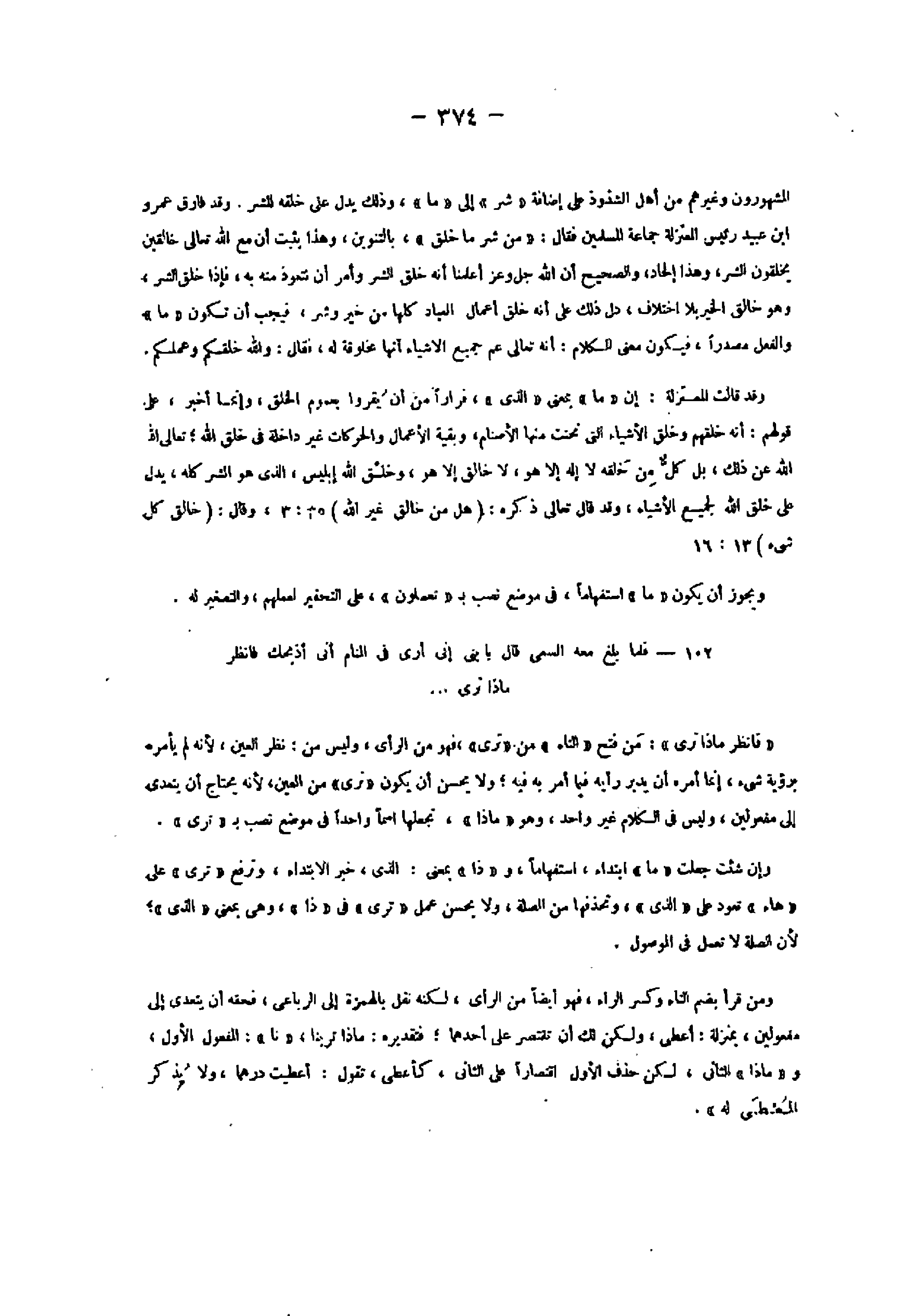 وقد قالت المعتزلة: إن «ما» بمعنى «الذي» ، فرارا من أن يقروا بعموم الخلق، وإنما أخبر، على قولهم: أنه خلقهم وخلق الأشياء التي نحتت منها الأصنام، وبقية الأعمال والحركات غير داخلة فى خلق الله تعالى الله الله عن ذلك، بل كلّ من خلقه لا إله إلا هو، لا خالق إلا هو، وخلق الله إبليس، الذي هو الشر كله، يدل على خلق الله لجميع الأشياء، وقد قال تعالى ذكره: (هَلْ مِنْ خالِقٍ غَيْرُ اللَّهِ) 35: 3، وقال: (خالِقُ كُلِّ شَيْءٍ) 13: 16 ويجوز أن يكون «ما» استفهاما، فى موضع نصب ب «تعملون» ، على التحقير لعلمهم، والتصغير له.