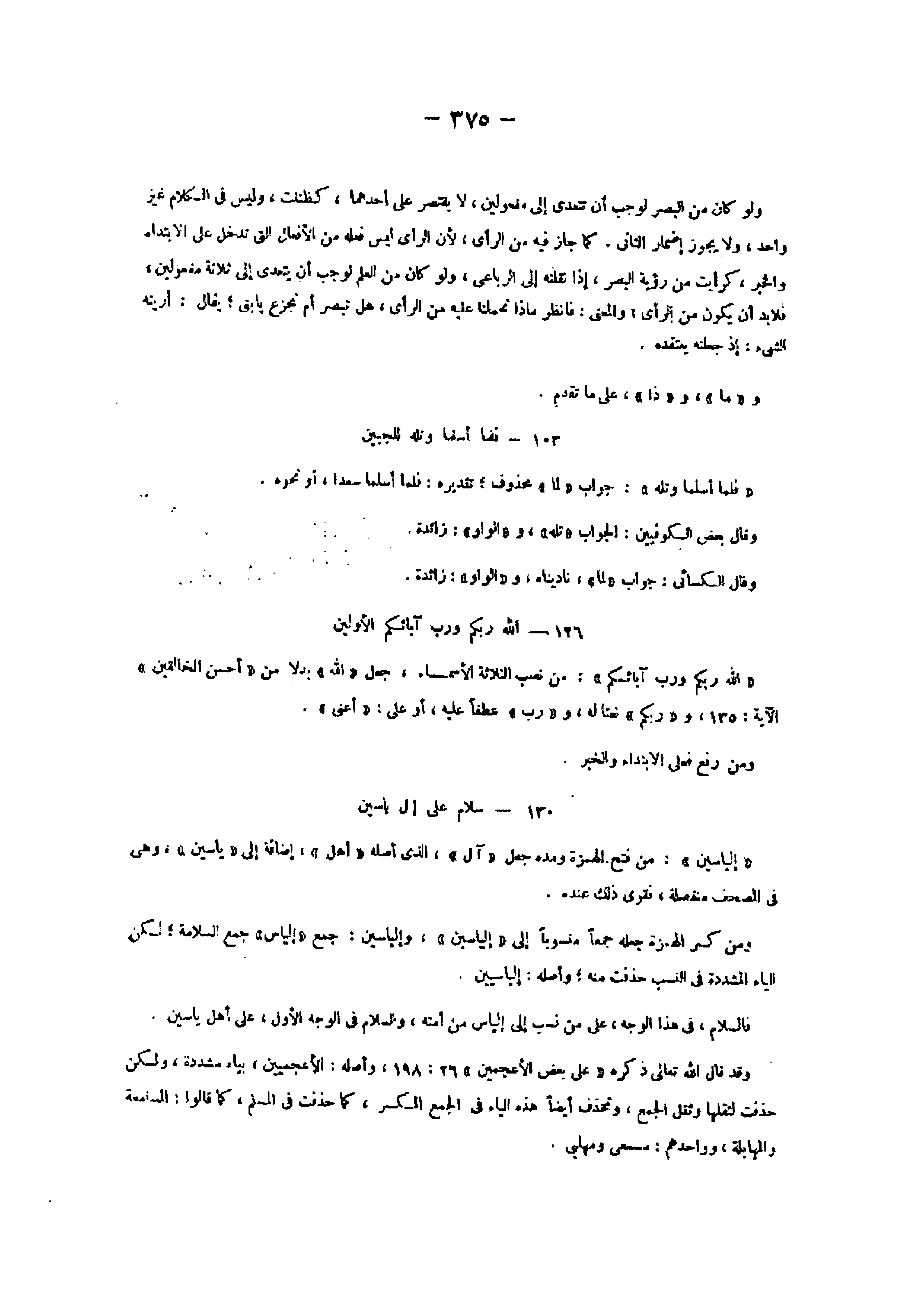 130- سَلامٌ عَلى إِلْ ياسِينَ «إلياسين» : من فتح الهمزة ومده جعل «آل» ، الذي أصله «أهل» ، إضافة إلى «ياسين» ، وهى فى المصحف منفصلة، فقوى ذلك عنده.