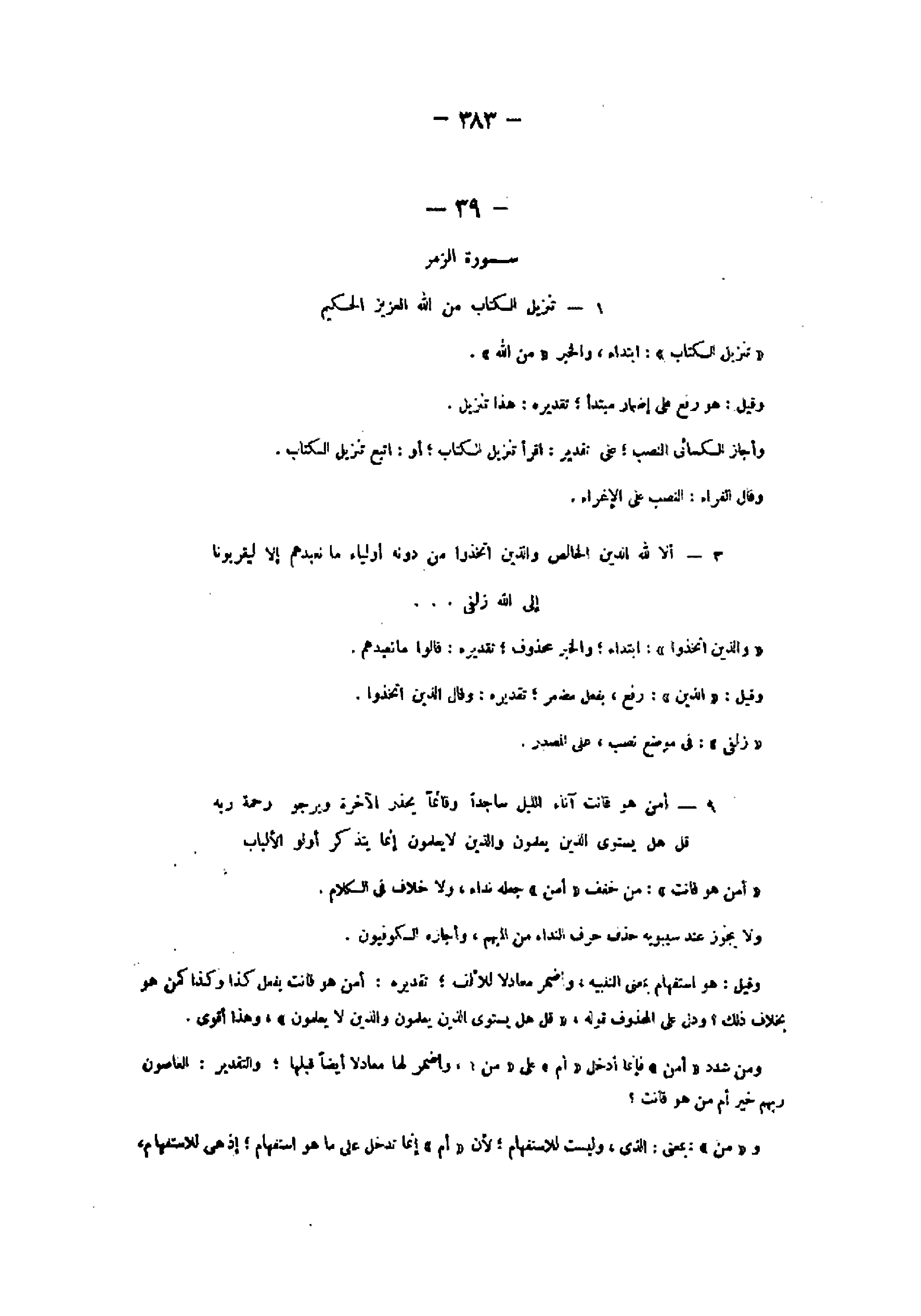 9- أَمَّنْ هُوَ قانِتٌ آناءَ اللَّيْلِ ساجِداً وَقائِماً يَحْذَرُ الْآخِرَةَ وَيَرْجُوا رَحْمَةَ رَبِّهِ قُلْ هَلْ يَسْتَوِي الَّذِينَ يَعْلَمُونَ وَالَّذِينَ لا يَعْلَمُونَ إِنَّما يَتَذَكَّرُ أُولُوا الْأَلْبابِ «أمن هو قانت» : من خفف «أمن» جعله نداء، ولا خلاف فى الكلام.