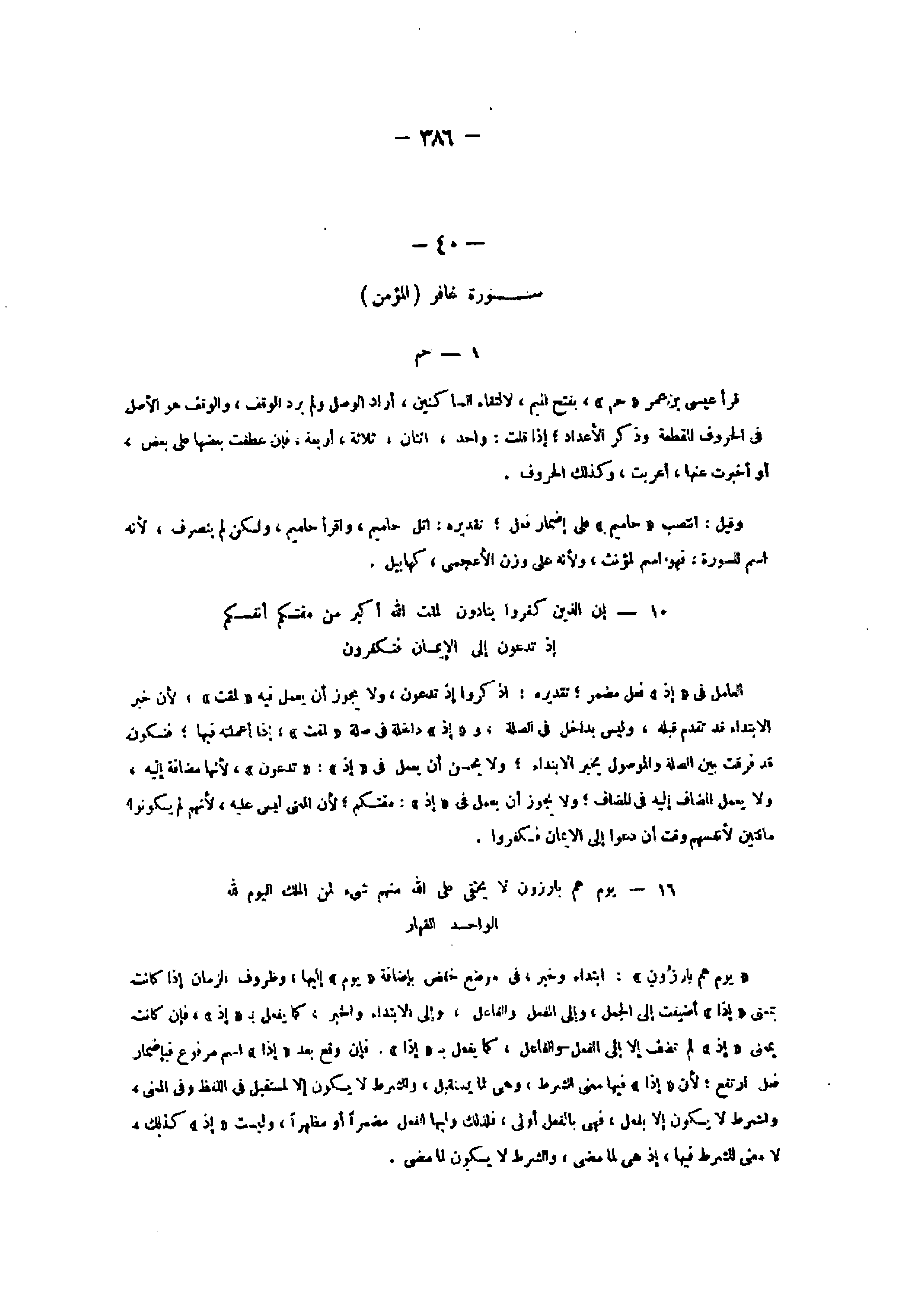 10- إِنَّ الَّذِينَ كَفَرُوا يُنادَوْنَ لَمَقْتُ اللَّهِ أَكْبَرُ مِنْ مَقْتِكُمْ أَنْفُسَكُمْ إِذْ تُدْعَوْنَ إِلَى الْإِيمانِ فَتَكْفُرُونَ العامل فى «إذ» فعل مضمر تقديره: اذكروا إذ تدعون، ولا يجوز أن يعمل فيه «لمقت» ، لأن خبر الابتداء، قد تقدم قبله، وليس بداخل فى الصلة، و «إذ» داخلة فى صلة «لمقت» ، إذا أعملته فيها فتكون قد فرقت بين الصلة والموصول بخبر الابتداء ولا يحسن أن يعمل فى «إذ» : «تدعون» ، لأنها مضافة إليه، ولا يعمل المضاف إليه فى المضاف ولا يجوز أن يعمل فى «إذ» : مقتكم لأن المعنى ليس عليه، لأنهم لم يكونوا ماقتين لأنفسهم وقت أن دعوا إلى الايمان فكفروا.