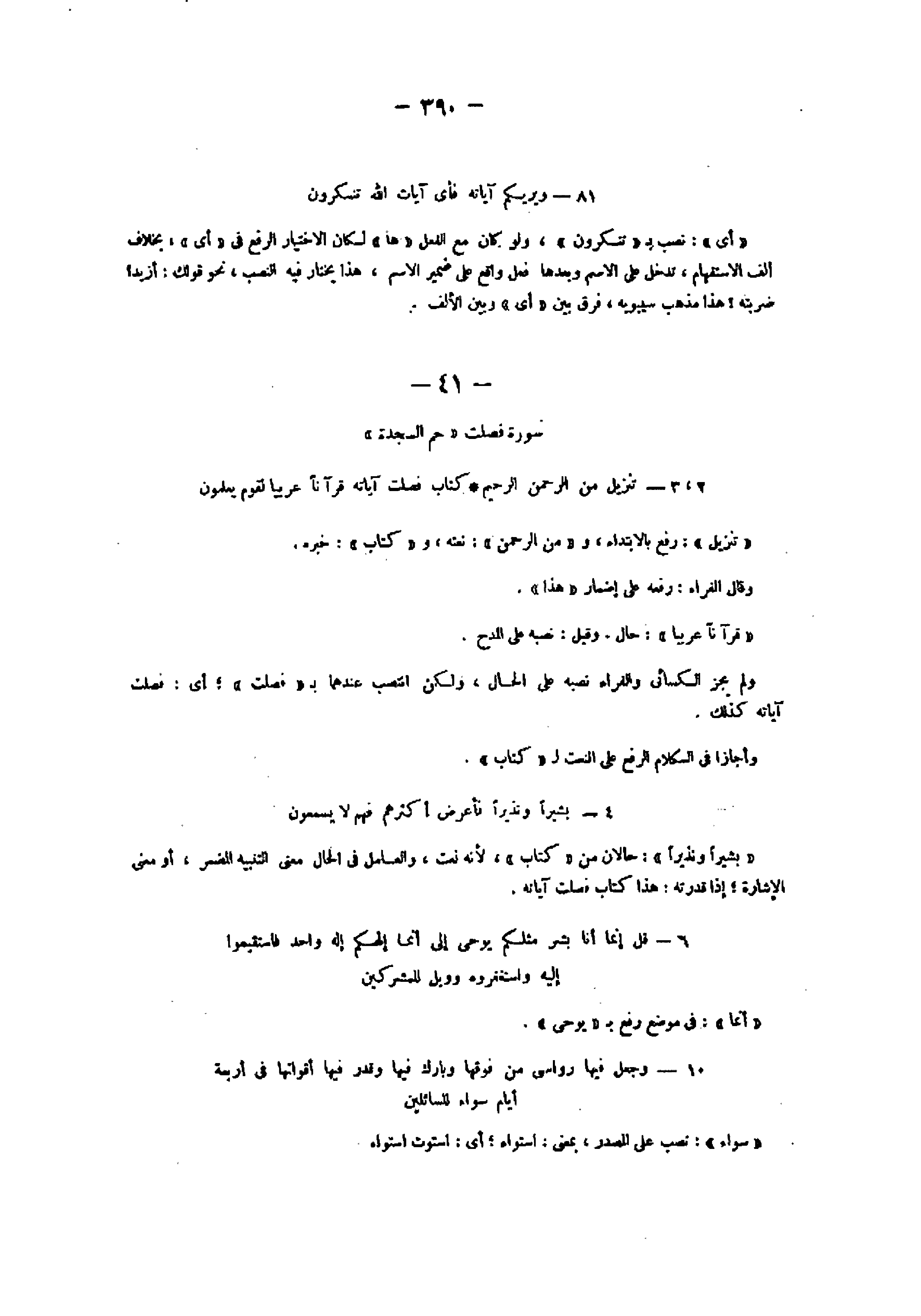 4- بَشِيراً وَنَذِيراً فَأَعْرَضَ أَكْثَرُهُمْ فَهُمْ لا يَسْمَعُونَ «بشيرا ونذيرا» : حالان من «كتاب» ، لأنه نعت، والعامل فى الحال معنى التنبيه المضمر، أو معنى الإشارة إذا قدرته: هذا كتاب فصلت آياته.
