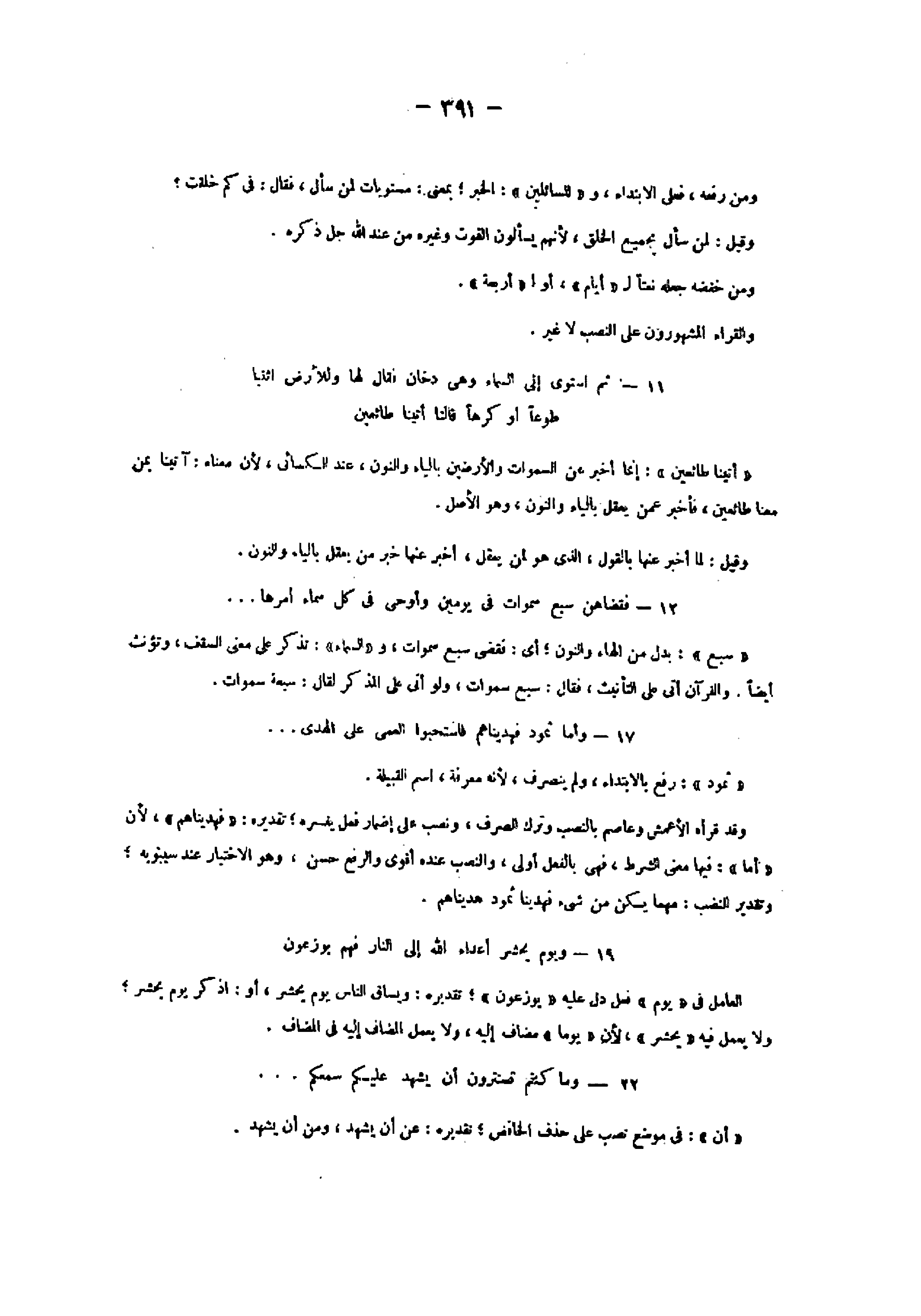11- ثُمَّ اسْتَوى إِلَى السَّماءِ وَهِيَ دُخانٌ فَقالَ لَها وَلِلْأَرْضِ ائْتِيا طَوْعاً أَوْ كَرْهاً قالَتا أَتَيْنا طائِعِينَ «أتينا طائعين» : إنما أخبر عن السموات والأرضين بالياء والنون، عند الكسائي، لأن معناه: آتينا بمن معنا طائعين، فأخبر عمن يعقل بالياء والنون، وهو الأصل.