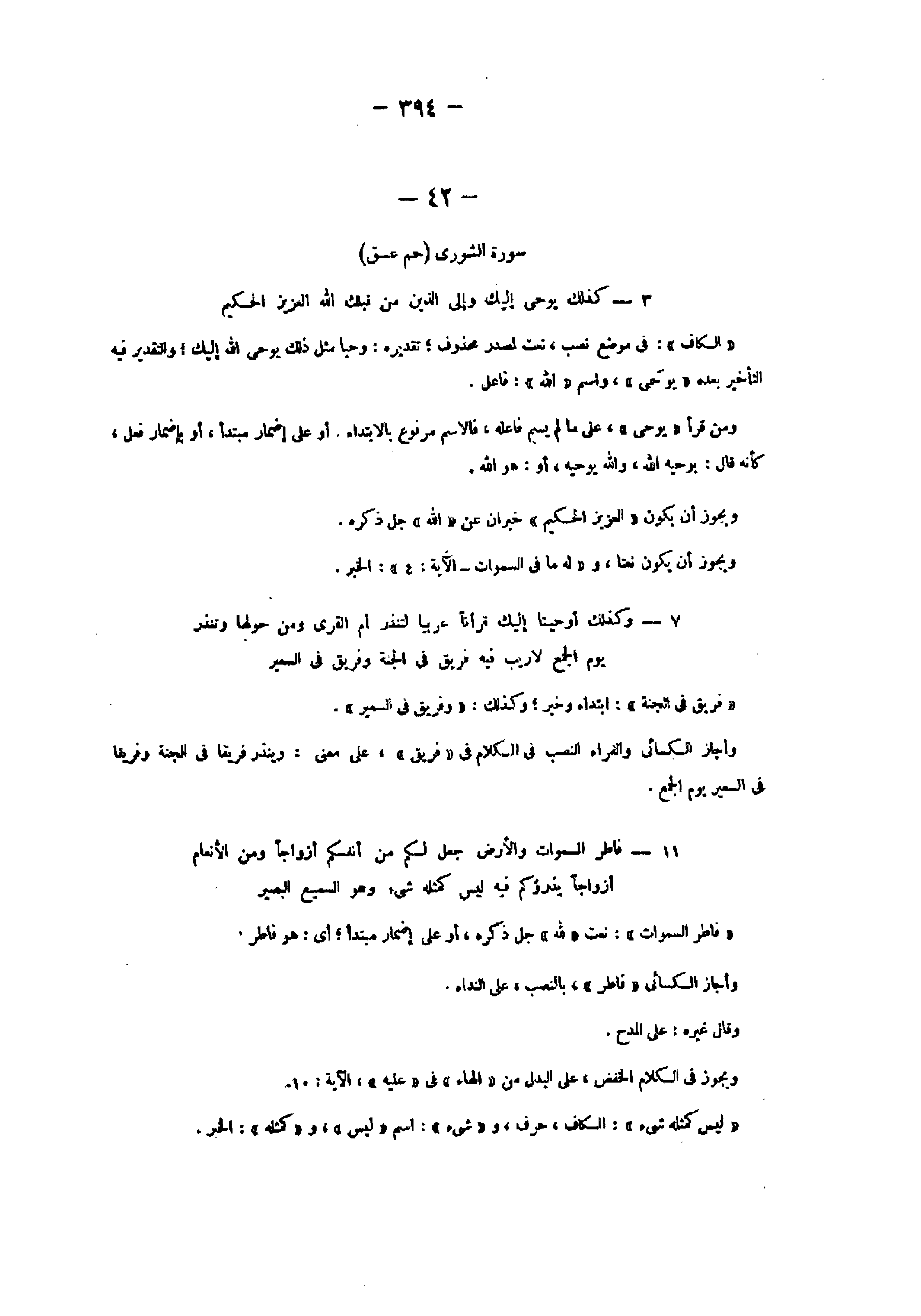 3- كَذلِكَ يُوحِي إِلَيْكَ وَإِلَى الَّذِينَ مِنْ قَبْلِكَ اللَّهُ الْعَزِيزُ الْحَكِيمُ «الكاف» : فى موضع نصب، نعت لمصدر محذوف تقديره: وحيا مثل ذلك يوحى الله إليك والتقدير فيه التأخير بعده «يوحى» ، واسم «الله» : فاعل.