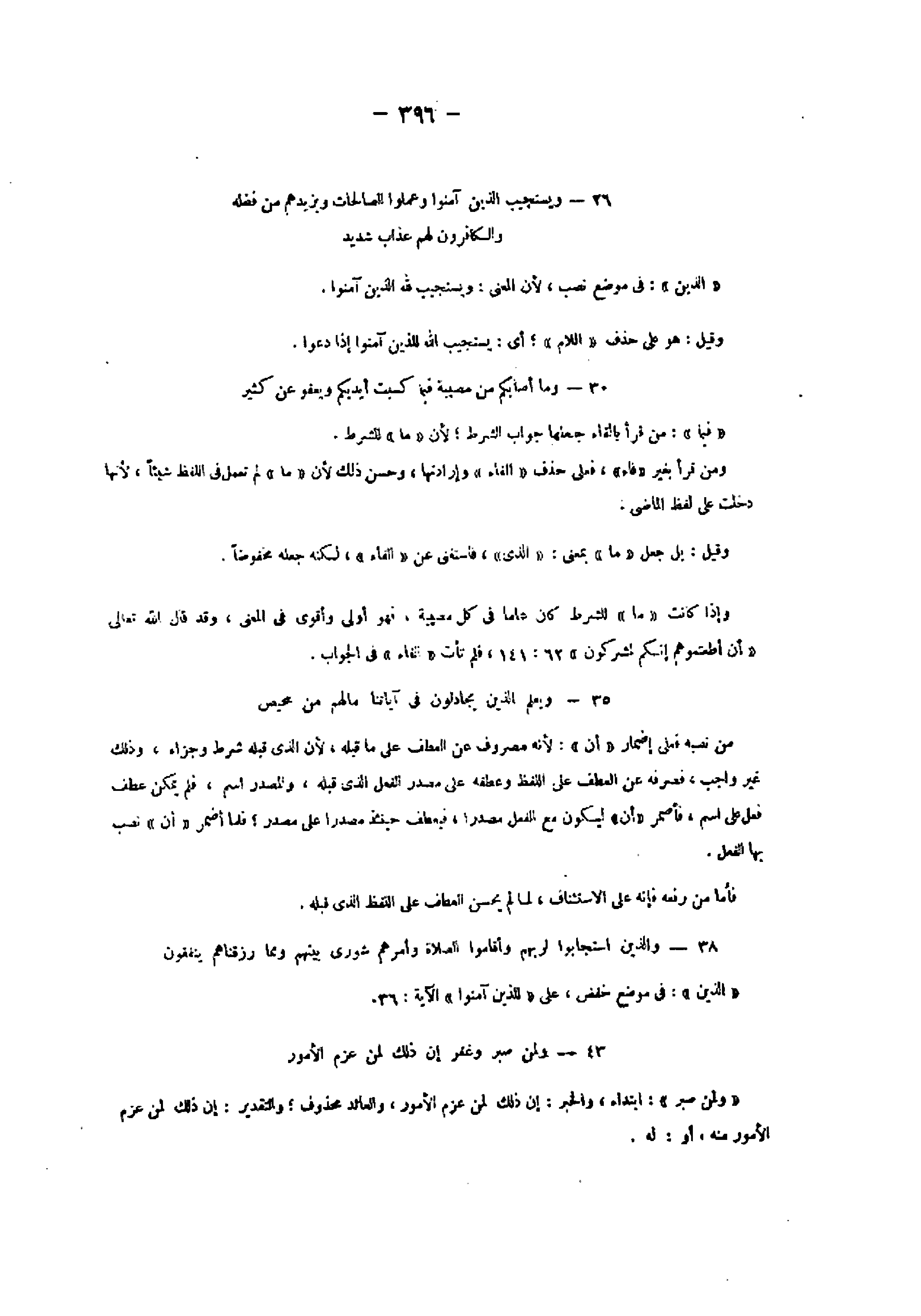 30- وَما أَصابَكُمْ مِنْ مُصِيبَةٍ فَبِما كَسَبَتْ أَيْدِيكُمْ وَيَعْفُوا عَنْ كَثِيرٍ «فبما» : من قرأ بالفاء جعلها جواب الشرط لأن «ما» للشرط.