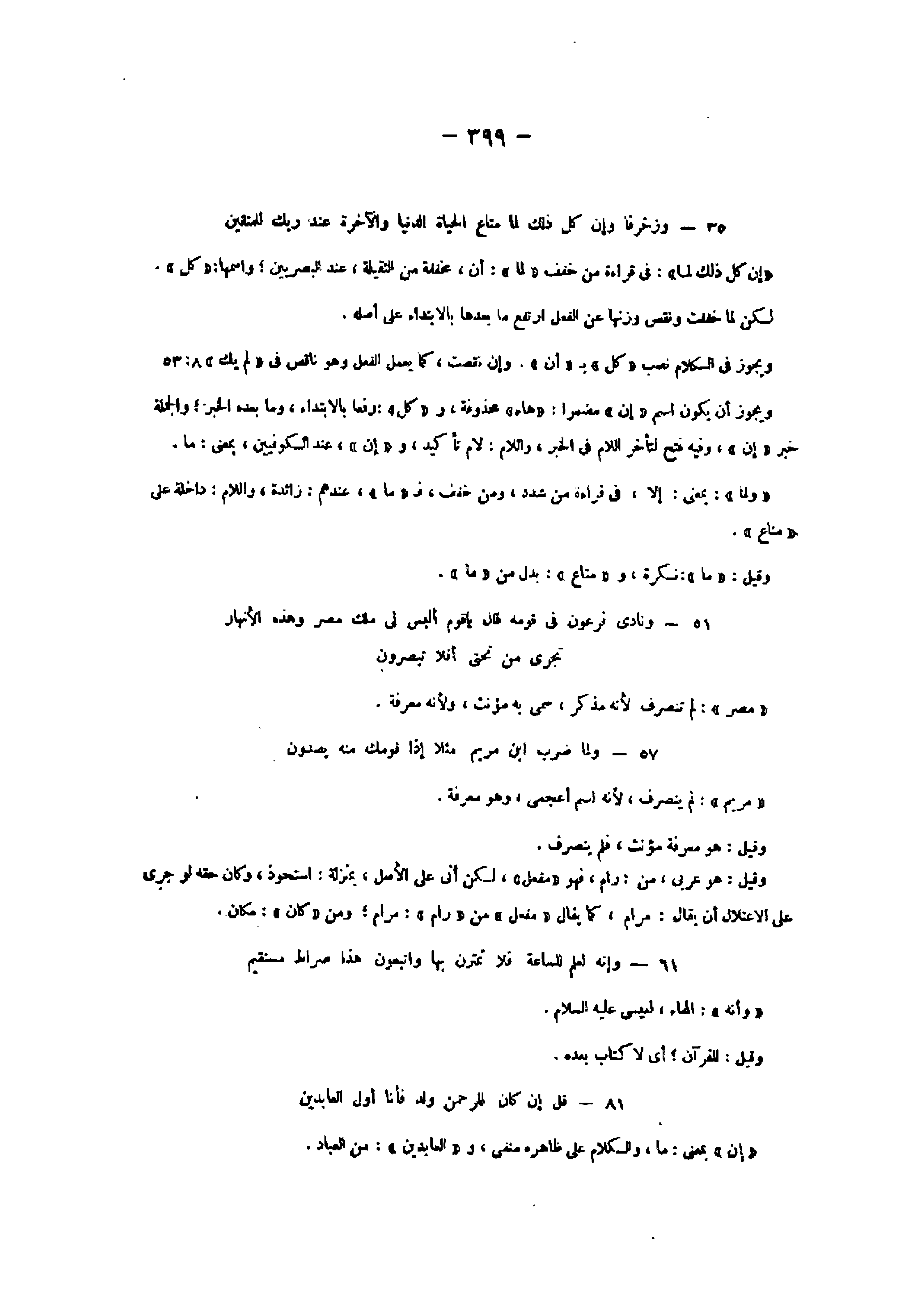 51- وَنادى فِرْعَوْنُ فِي قَوْمِهِ قالَ يا قَوْمِ أَلَيْسَ لِي مُلْكُ مِصْرَ وَهذِهِ الْأَنْهارُ تَجْرِي مِنْ تَحْتِي أَفَلا تُبْصِرُونَ «مصر» : لم تنصرف لأنه مذكر، سمى به مؤنث، ولأنه معرفة.