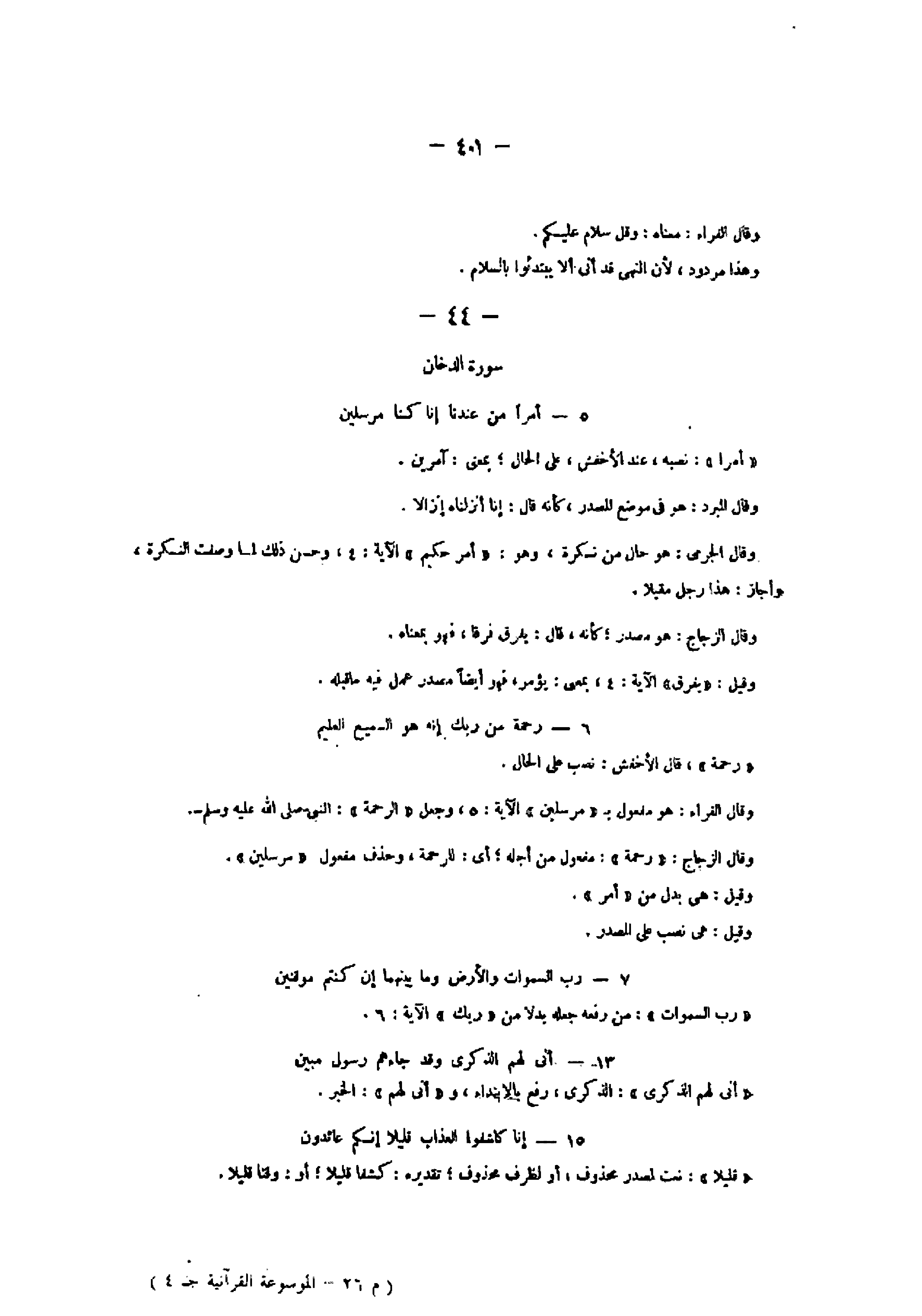 5- أَمْراً مِنْ عِنْدِنا إِنَّا كُنَّا مُرْسِلِينَ «أمرا» : نصبه، عند الأخفش، على الحال بمعنى: آمرين.
