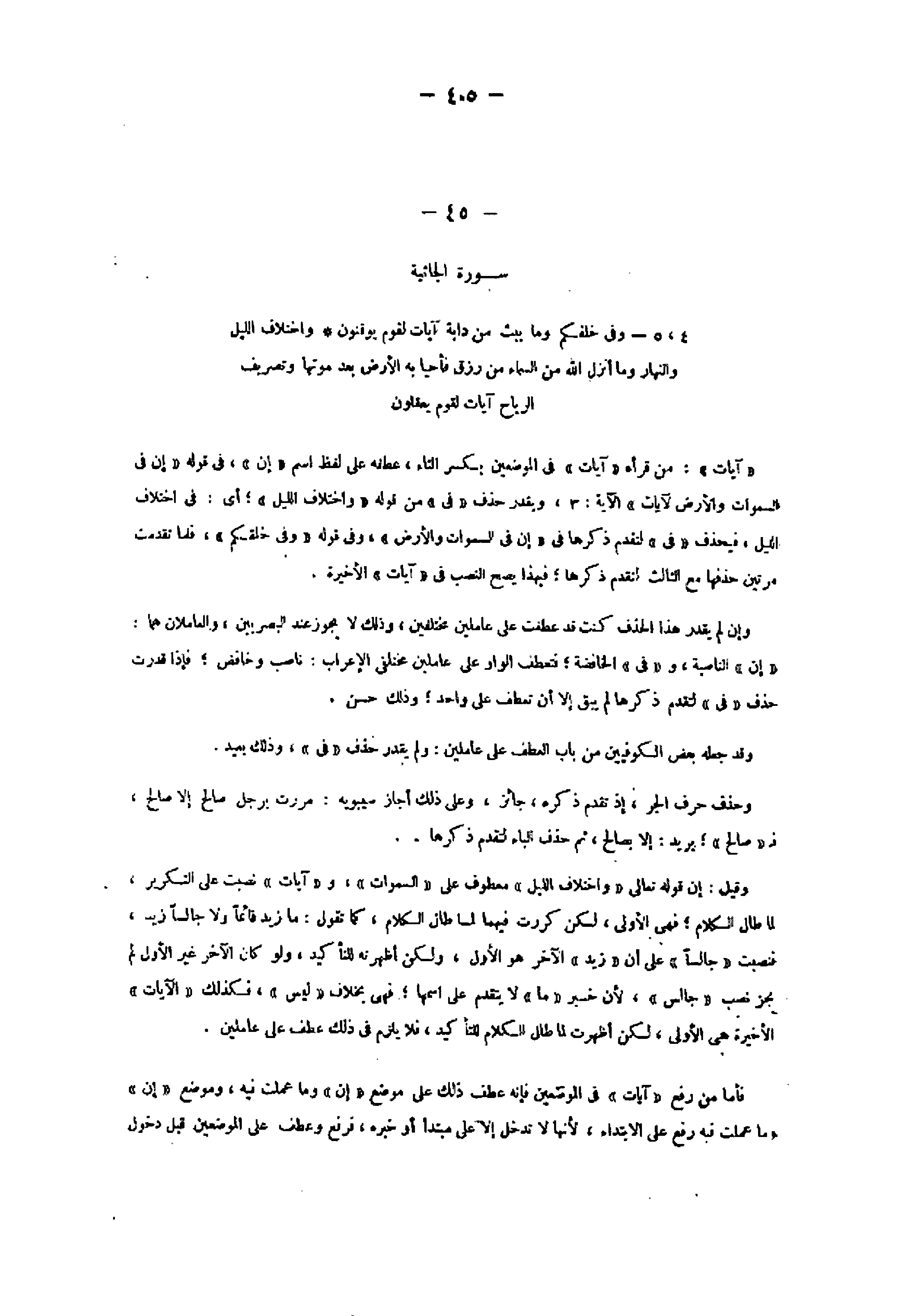 4، 5- وَفِي خَلْقِكُمْ وَما يَبُثُّ مِنْ دابَّةٍ آياتٌ لِقَوْمٍ يُوقِنُونَ وَاخْتِلافِ اللَّيْلِ وَالنَّهارِ وَما أَنْزَلَ اللَّهُ مِنَ السَّماءِ مِنْ رِزْقٍ فَأَحْيا بِهِ الْأَرْضَ بَعْدَ مَوْتِها وَتَصْرِيفِ الرِّياحِ آياتٌ لِقَوْمٍ يَعْقِلُونَ «آيات» : من قرأه «آيات» فى الموضعين بكسر التاء، عطفه على لفظ اسم «إن» ، فى قوله «إن فى السموات والأرض لآيات» الآية: 3، ويقدر حذف «فى» من قوله «واختلاف الليل» أي: فى اختلاف الليل، فيحذف «فى» لتقدم ذكرها فى «إن فى السموات والأرض» ، وفى قوله «وفى خلقكم» ، فلما تقدمت مرتين حذفها مع الثالث لتقدم ذكرها فبهذا يصح النصب فى «آيات» الأخيرة.