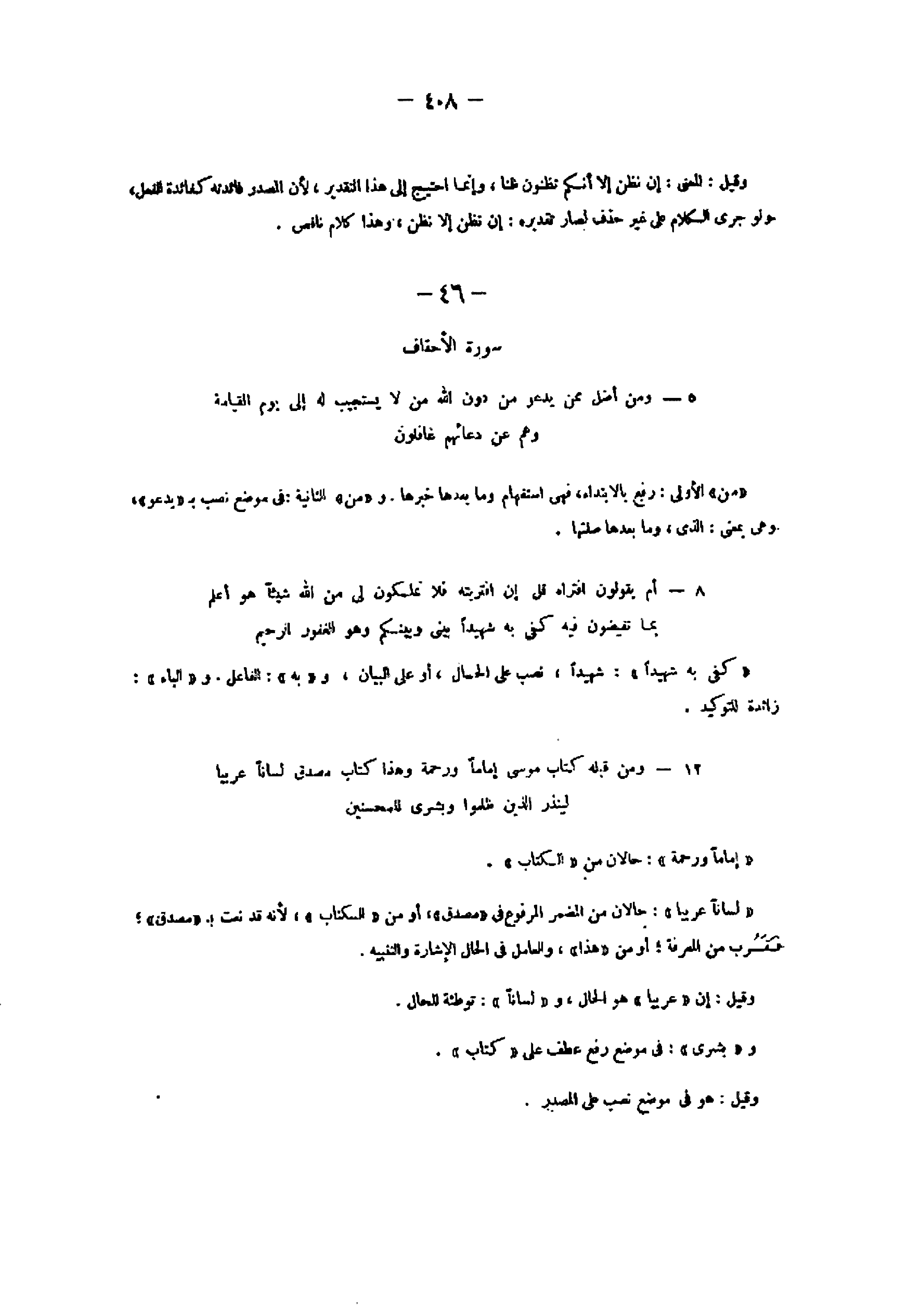 12- وَمِنْ قَبْلِهِ كِتابُ مُوسى إِماماً وَرَحْمَةً وَهذا كِتابٌ مُصَدِّقٌ لِساناً عَرَبِيًّا لِيُنْذِرَ الَّذِينَ ظَلَمُوا وَبُشْرى لِلْمُحْسِنِينَ «إماما ورحمة» : حالان من «الكتاب» .