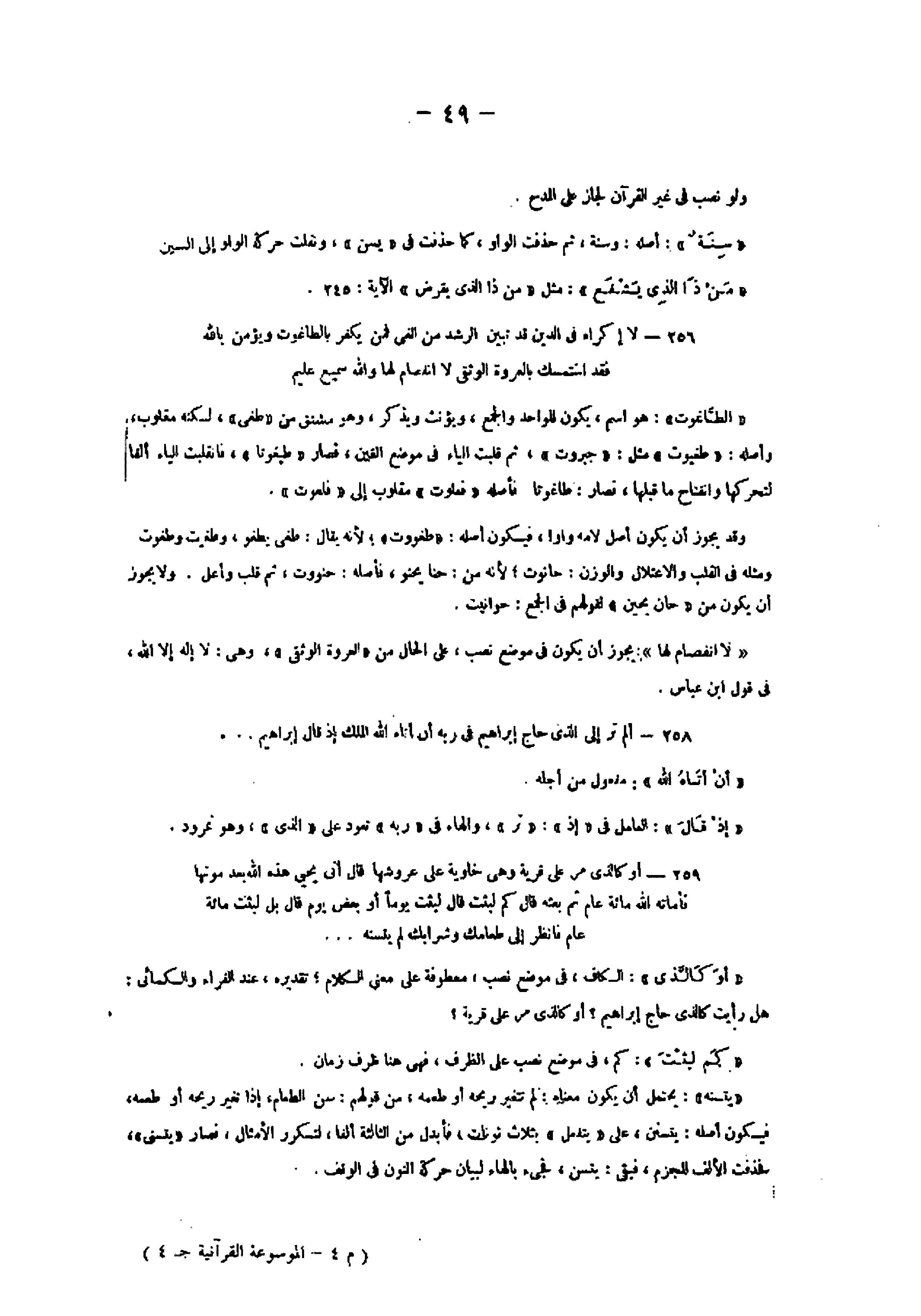 256- لا إِكْراهَ فِي الدِّينِ قَدْ تَبَيَّنَ الرُّشْدُ مِنَ الْغَيِّ فَمَنْ يَكْفُرْ بِالطَّاغُوتِ وَيُؤْمِنْ بِاللَّهِ فَقَدِ اسْتَمْسَكَ بِالْعُرْوَةِ الْوُثْقى لَا انْفِصامَ لَها وَاللَّهُ سَمِيعٌ عَلِيمٌ «الطّاغوت» : هو اسم، يكون للواحد والجمع، ويؤنث ويذكر، وهو مشتق من «طغى» ، لكنه مقلوب، وأصله: «طغيوت» مثل: «جبروت» ، ثم قلبت الياء فى موضع الغين، فصار «طيغوتا» ، فانقلبت الياء ألفا لتحركها وانفتاح ما قبلها، فصار: طاغوتا فأصله «فعلوت» مقلوب إلى «فلعوت» .
