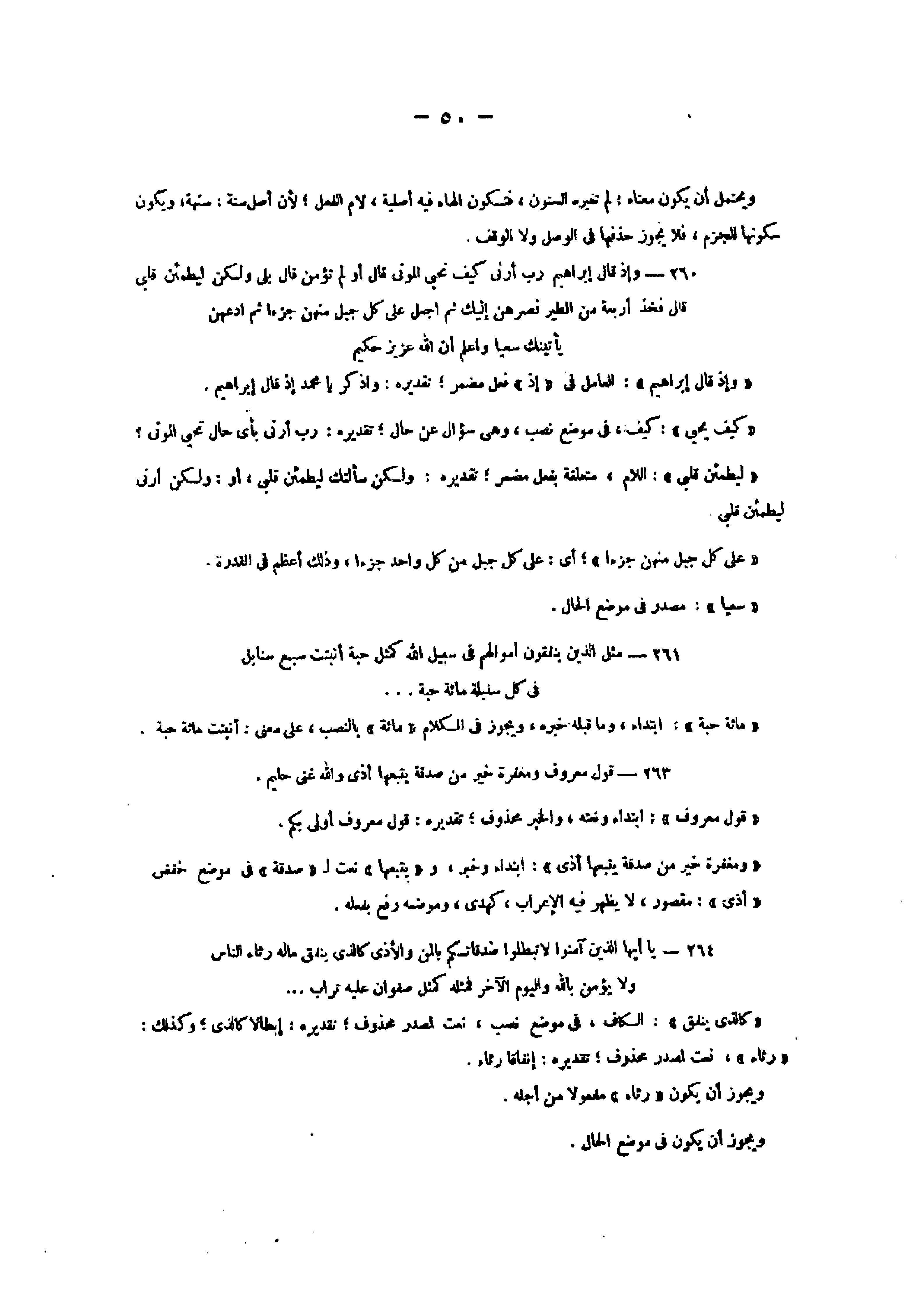 260- وَإِذْ قالَ إِبْراهِيمُ رَبِّ أَرِنِي كَيْفَ تُحْيِ الْمَوْتى قالَ أَوَلَمْ تُؤْمِنْ قالَ بَلى وَلكِنْ لِيَطْمَئِنَّ قَلْبِي قالَ فَخُذْ أَرْبَعَةً مِنَ الطَّيْرِ فَصُرْهُنَّ إِلَيْكَ ثُمَّ اجْعَلْ عَلى كُلِّ جَبَلٍ مِنْهُنَّ جُزْءاً ثُمَّ ادْعُهُنَّ يَأْتِينَكَ سَعْياً وَاعْلَمْ أَنَّ اللَّهَ عَزِيزٌ حَكِيمٌ «وإذ قال إبراهيم» : العامل فى «إذ» فعل مضمر تقديره: واذكر يا محمد إذ قال إبراهيم.