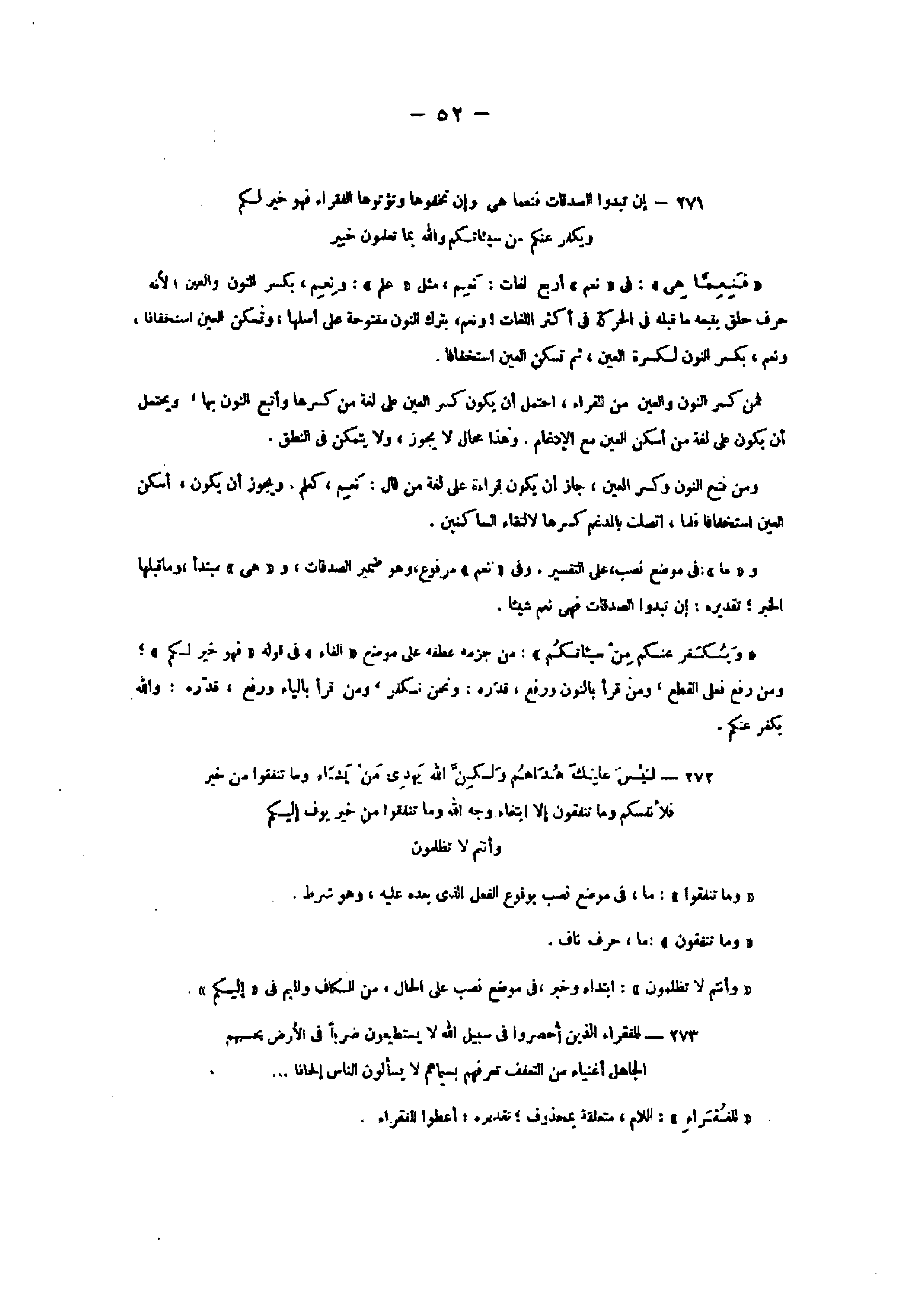 271- إِنْ تُبْدُوا الصَّدَقاتِ فَنِعِمَّا هِيَ وَإِنْ تُخْفُوها وَتُؤْتُوهَا الْفُقَراءَ فَهُوَ خَيْرٌ لَكُمْ وَيُكَفِّرُ عَنْكُمْ مِنْ سَيِّئاتِكُمْ وَاللَّهُ بِما تَعْمَلُونَ خَبِيرٌ «فنعمّا هى» : فى «نعم» أربع لغات: نعم، مثل «علم» : ونعم، بكسر النون والعين لأنه حرف حلق يتبعه ما قبله فى الحركة فى أكثر اللغات ونعم، بترك النون مفتوحة على أصلها، وتسكن العين استخفافا، ونعم، بكسر النون لكسرة العين، ثم تسكن العين استخفافا.