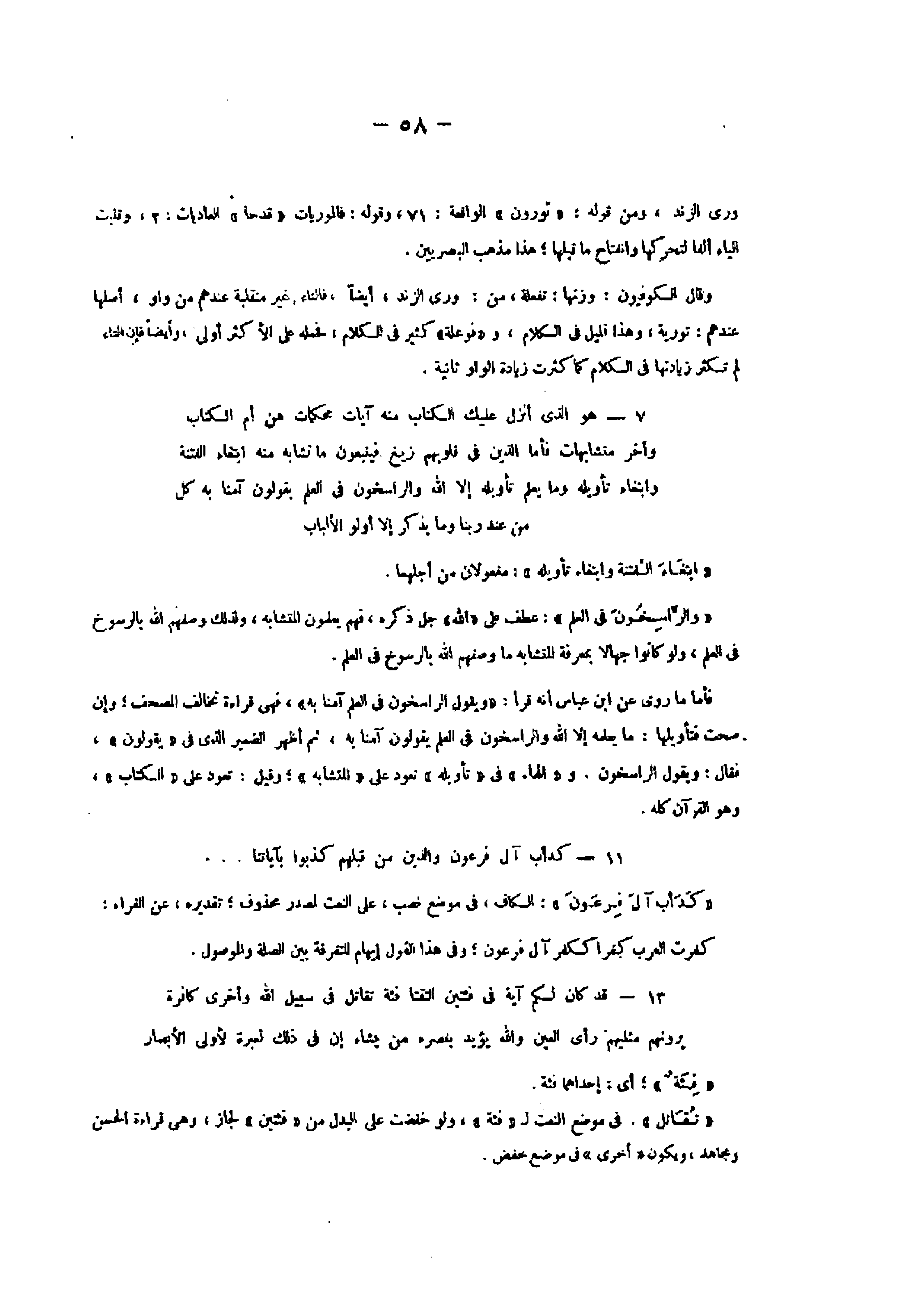 «والرّاسخون فى العلم» : عطف على «الله» جل ذكره، فهم يعلمون المتشابه، ولذلك وصفهم الله بالرسوخ فى العلم، ولو كانوا جهالا بمعرفة المتشابه ما وصفهم الله بالرسوخ فى العلم.