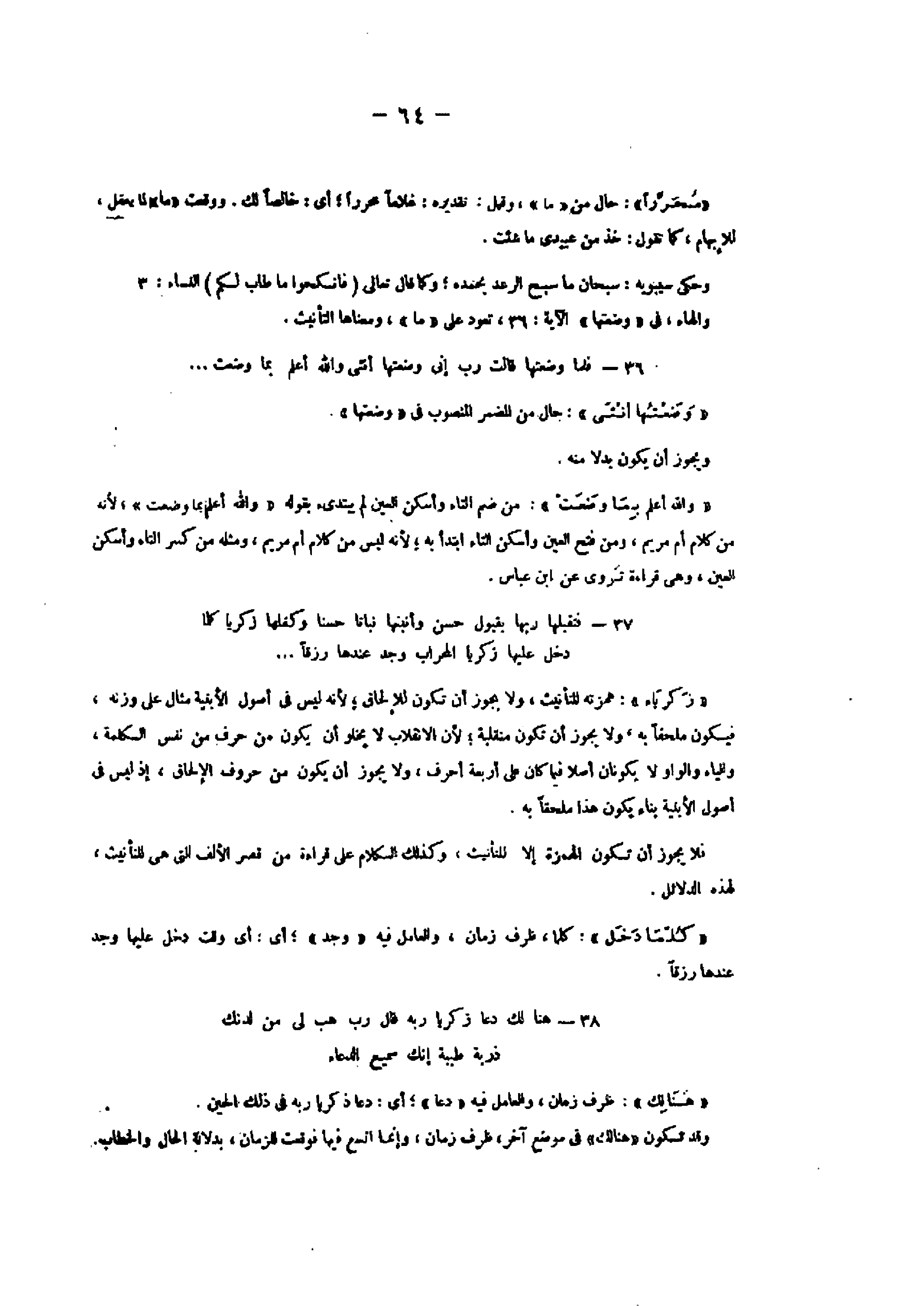 «زكريّاء» : همزته للتأنيث، ولا يجوز أن تكون للإلحاق لأنه ليس فى أصول الأبنية مثال على وزنه، فيكون ملحقا به، ولا يجوز أن تكون منقلبة لأن الانقلاب لا يخلو أن يكون من حرف من نفس الكلمة، والياء والواو لا يكونان أصلا فيما كان على أربعة أحرف، ولا يجوز أن يكون من حروف الإلحاق، إذ ليس فى أصول الأبنية بناء يكون هذا ملحقا به.