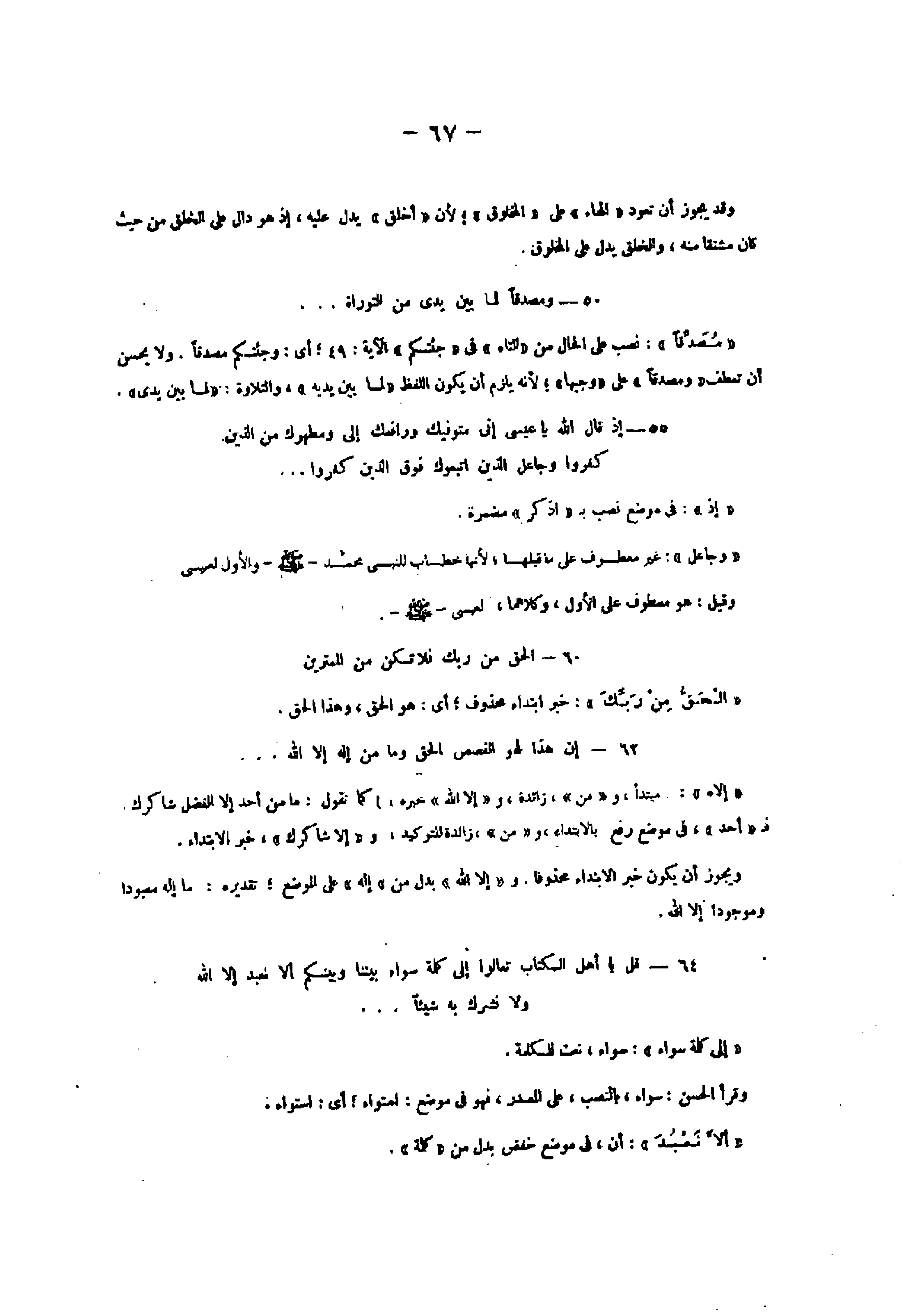 «مصدّقا» : نصب على الحال من «التاء» فى «جئتكم» الآية: 49 أي: وجئتكم مصدقا. ولا يحسن أن تعطف «ومصدقا» على «وجيها» لأنه يلزم أن يكون اللفظ «لما بين يديه» ، والتلاوة: «لما بين يدى» .