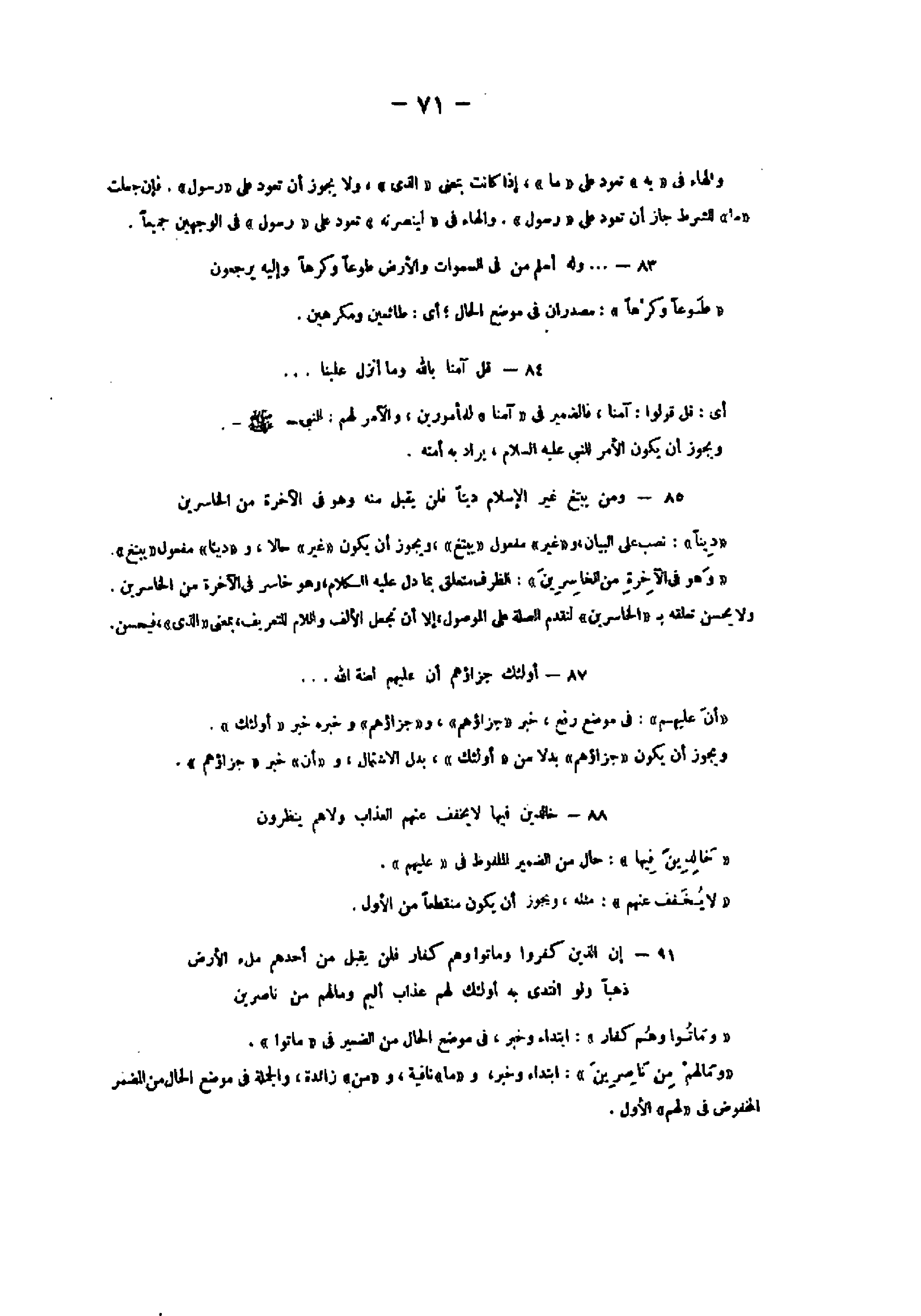 83- ... وَلَهُ أَسْلَمَ مَنْ فِي السَّماواتِ وَالْأَرْضِ طَوْعاً وَكَرْهاً وَإِلَيْهِ يُرْجَعُونَ «طوعا وكرها» : مصدران فى موضع الحال أي: طائعين ومكرهين.