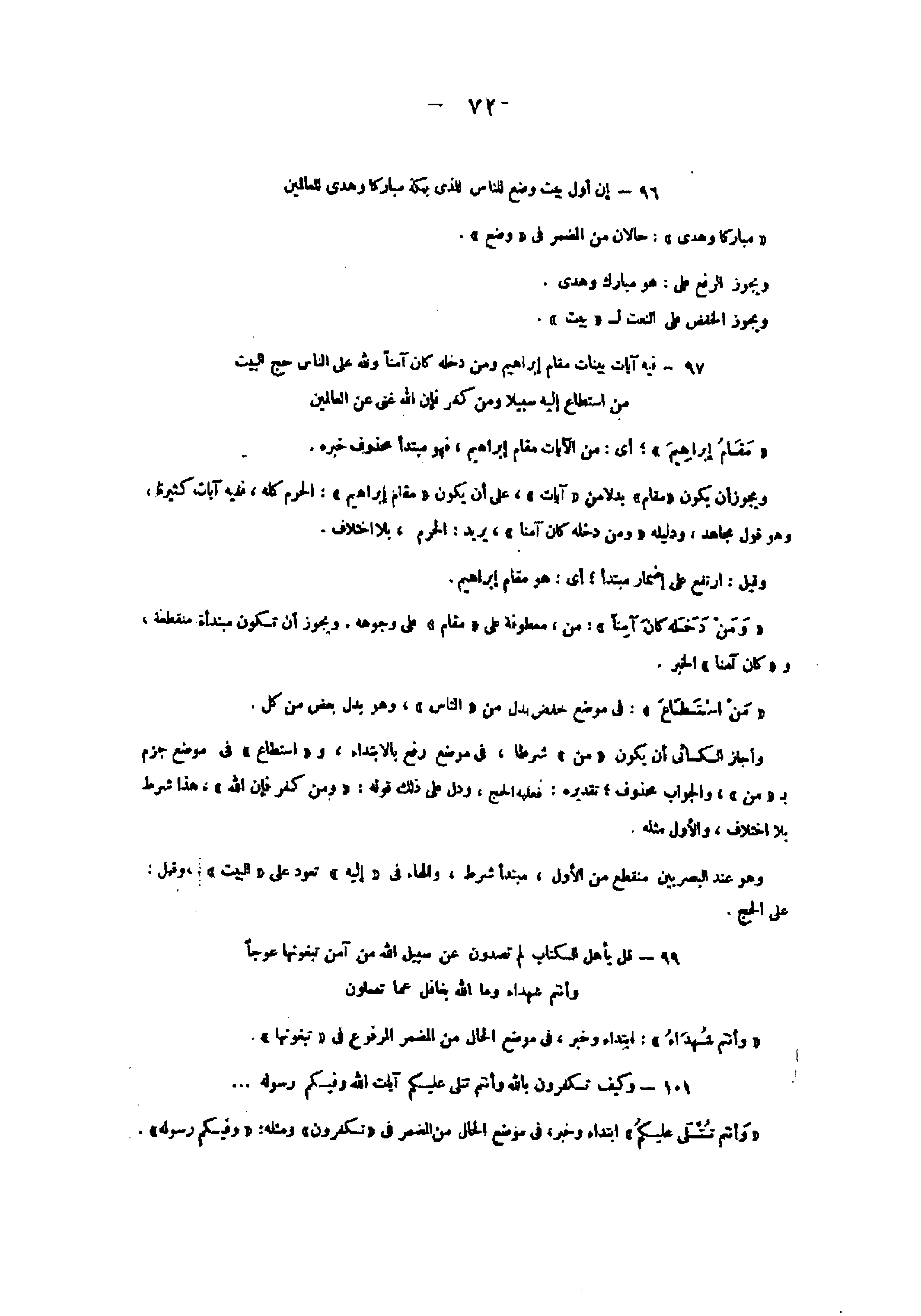 96- إِنَّ أَوَّلَ بَيْتٍ وُضِعَ لِلنَّاسِ لَلَّذِي بِبَكَّةَ مُبارَكاً وَهُدىً لِلْعالَمِينَ «مباركا وهدى» : حالان من المضمر فى «وضع» .