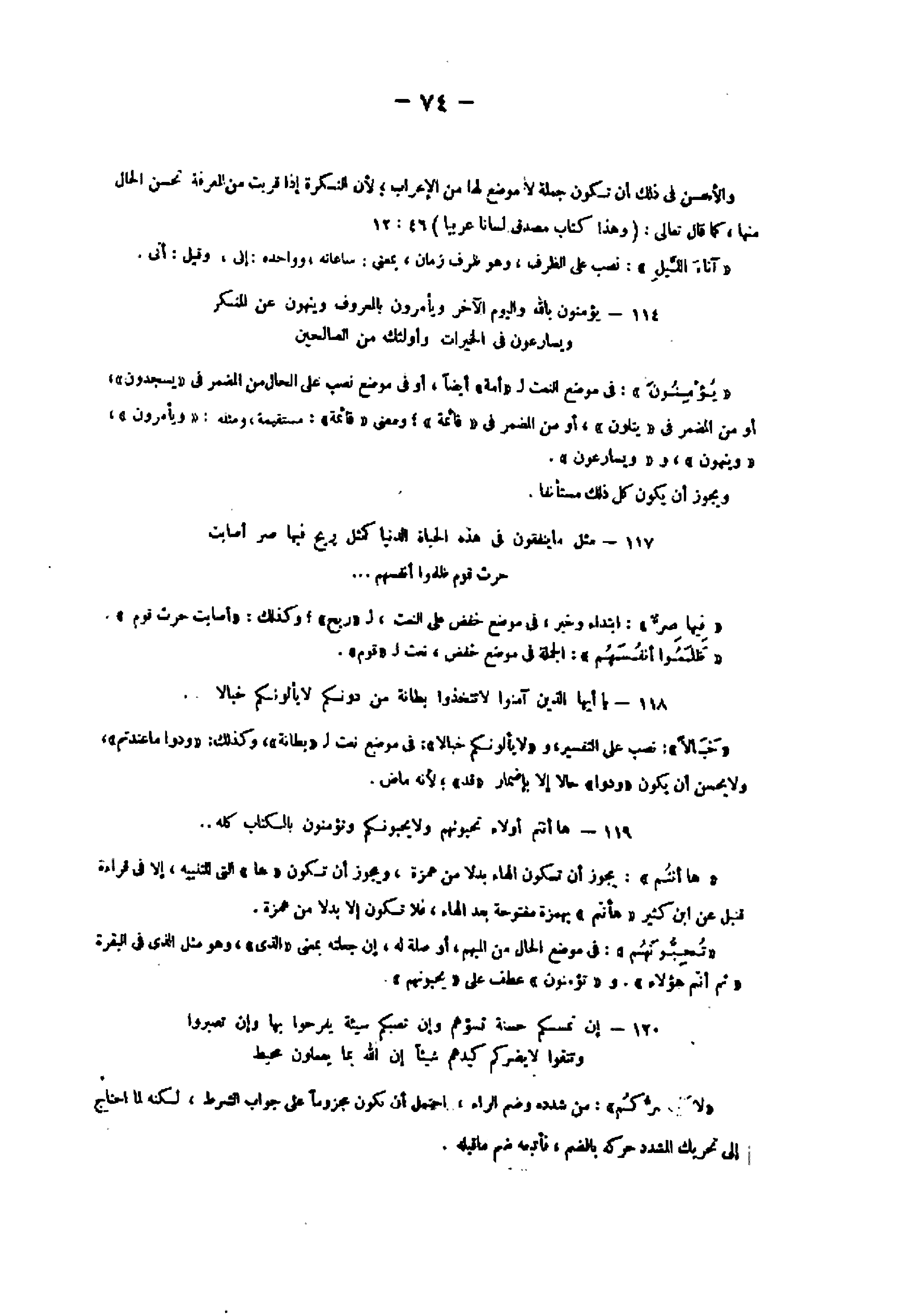 114- يُؤْمِنُونَ بِاللَّهِ وَالْيَوْمِ الْآخِرِ وَيَأْمُرُونَ بِالْمَعْرُوفِ وَيَنْهَوْنَ عَنِ الْمُنْكَرِ وَيُسارِعُونَ فِي الْخَيْراتِ وَأُولئِكَ مِنَ الصَّالِحِينَ «يؤمنون» : فى موضع النعت ل «أمة» أيضا، أو فى موضع نصب على الحال من المضمر فى «يسجدون» ، أو من المضمر فى «يتلون» ، أو من المضمر فى «قائمة» ومعنى «قائمة» : مستقيمة، ومثله: «ويأمرون» ، «وينهون» ، و «ويسارعون» .