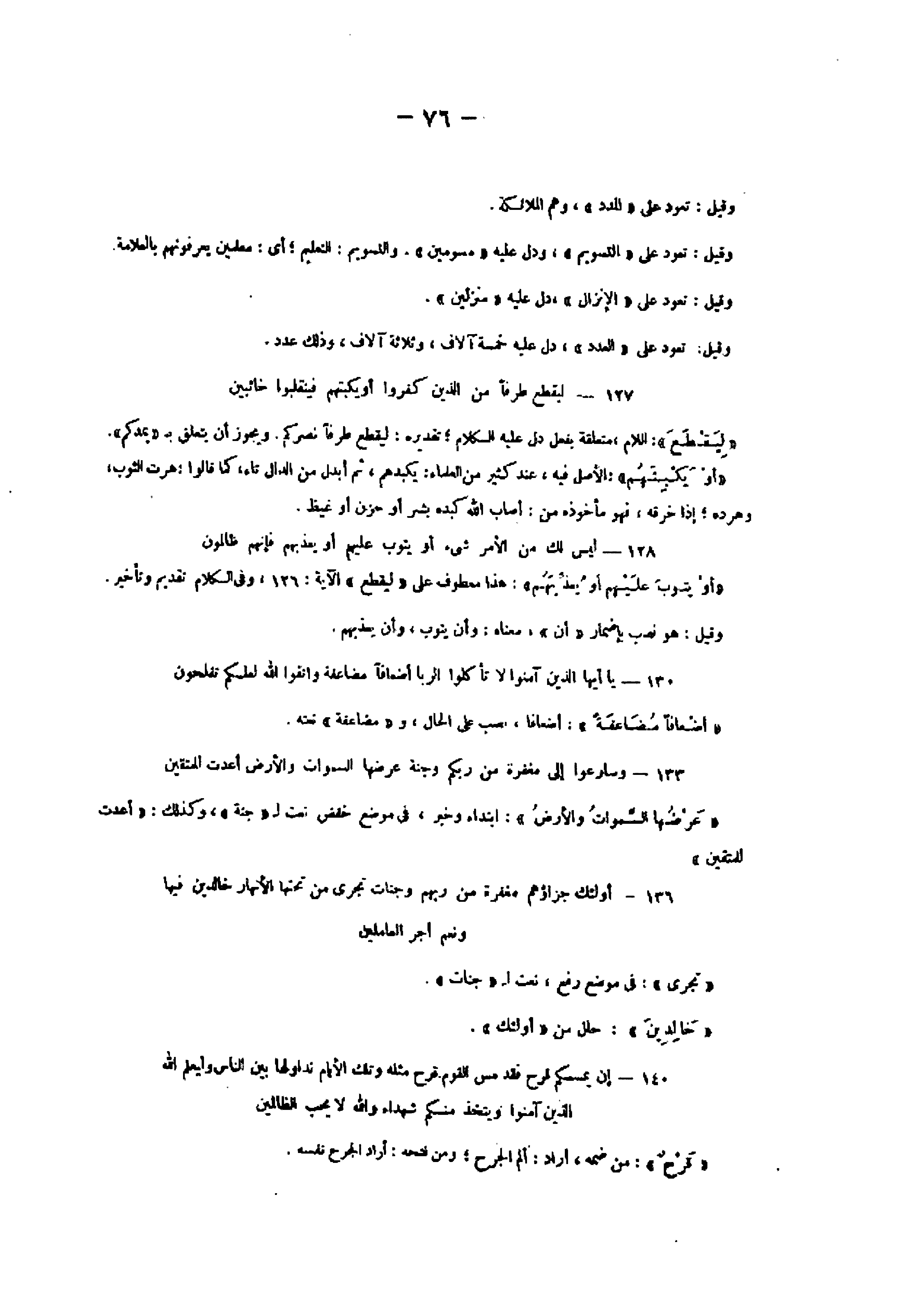 127- لِيَقْطَعَ طَرَفاً مِنَ الَّذِينَ كَفَرُوا أَوْ يَكْبِتَهُمْ فَيَنْقَلِبُوا خائِبِينَ «ليقطع» : اللام، متعلقة بفعل دل عليه الكلام تقديره: ليقطع طرفا نصركم. ويجوز أن يتعلق ب «يمدكم» .