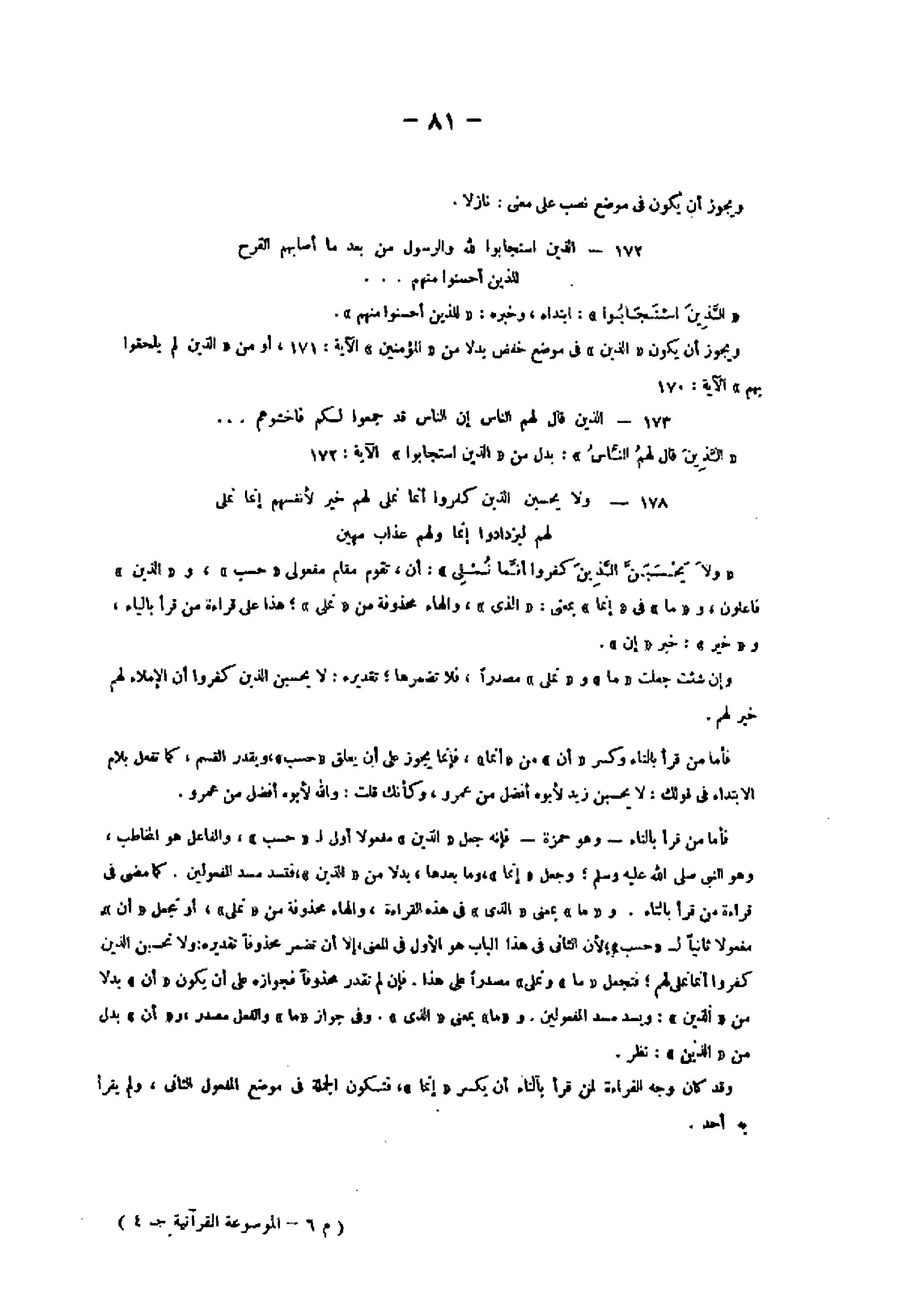 ويجوز أن يكون «الذين» فى موضع خفض بدلا من «المؤمنين» الآية: 171، أو من «الذين لم يلحقوا بهم» الآية: 170 173- الَّذِينَ قالَ لَهُمُ النَّاسُ إِنَّ النَّاسَ قَدْ جَمَعُوا لَكُمْ فَاخْشَوْهُمْ ...