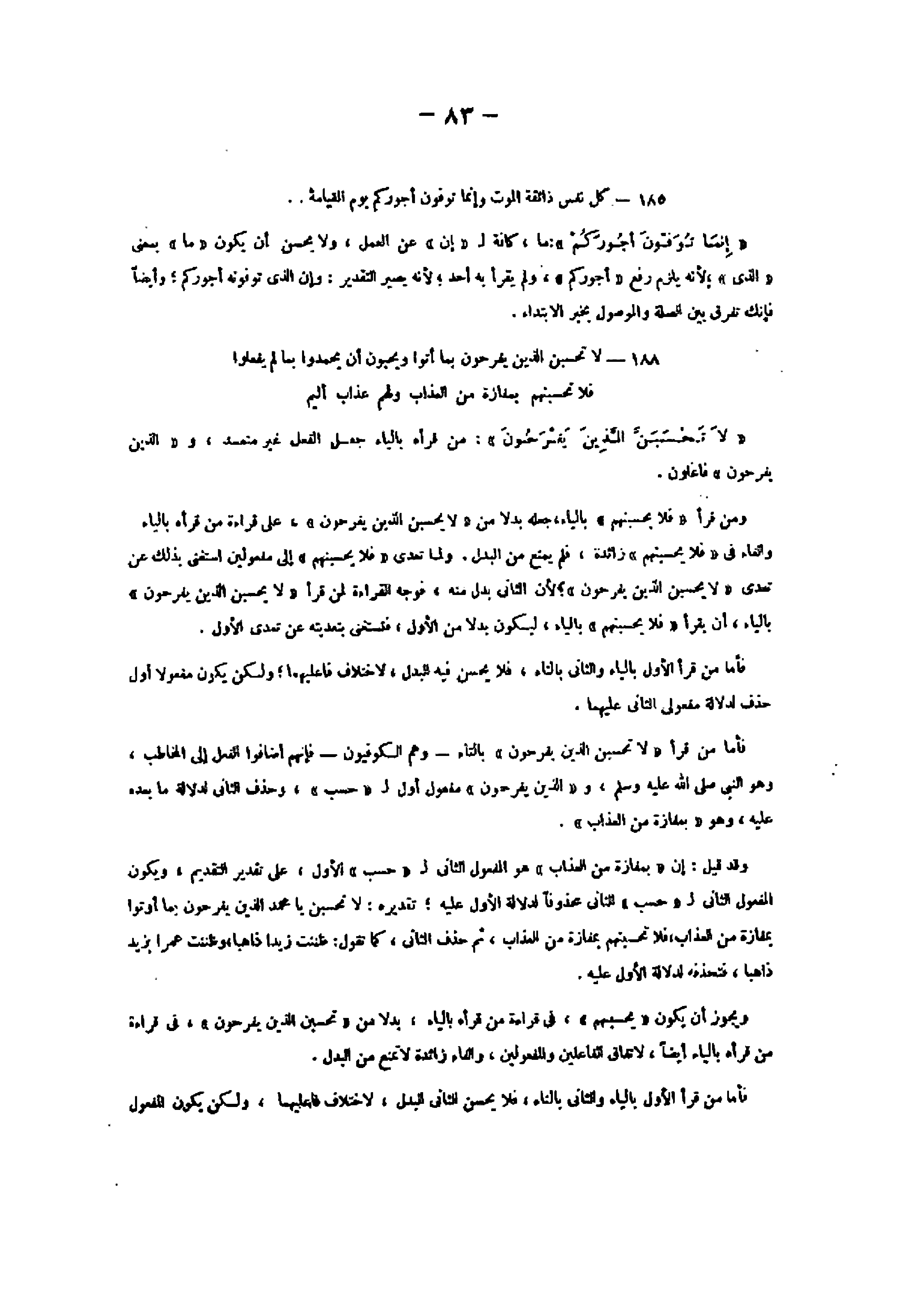 188- لا تَحْسَبَنَّ الَّذِينَ يَفْرَحُونَ بِما أَتَوْا وَيُحِبُّونَ أَنْ يُحْمَدُوا بِما لَمْ يَفْعَلُوا فَلا تَحْسَبَنَّهُمْ بِمَفازَةٍ مِنَ الْعَذابِ وَلَهُمْ عَذابٌ أَلِيمٌ «لا تحسبنّ الّذين يفرحون» : من قرأه بالياء جعل الفعل غير متعد، و «الذين يفرحون» فاعلون.