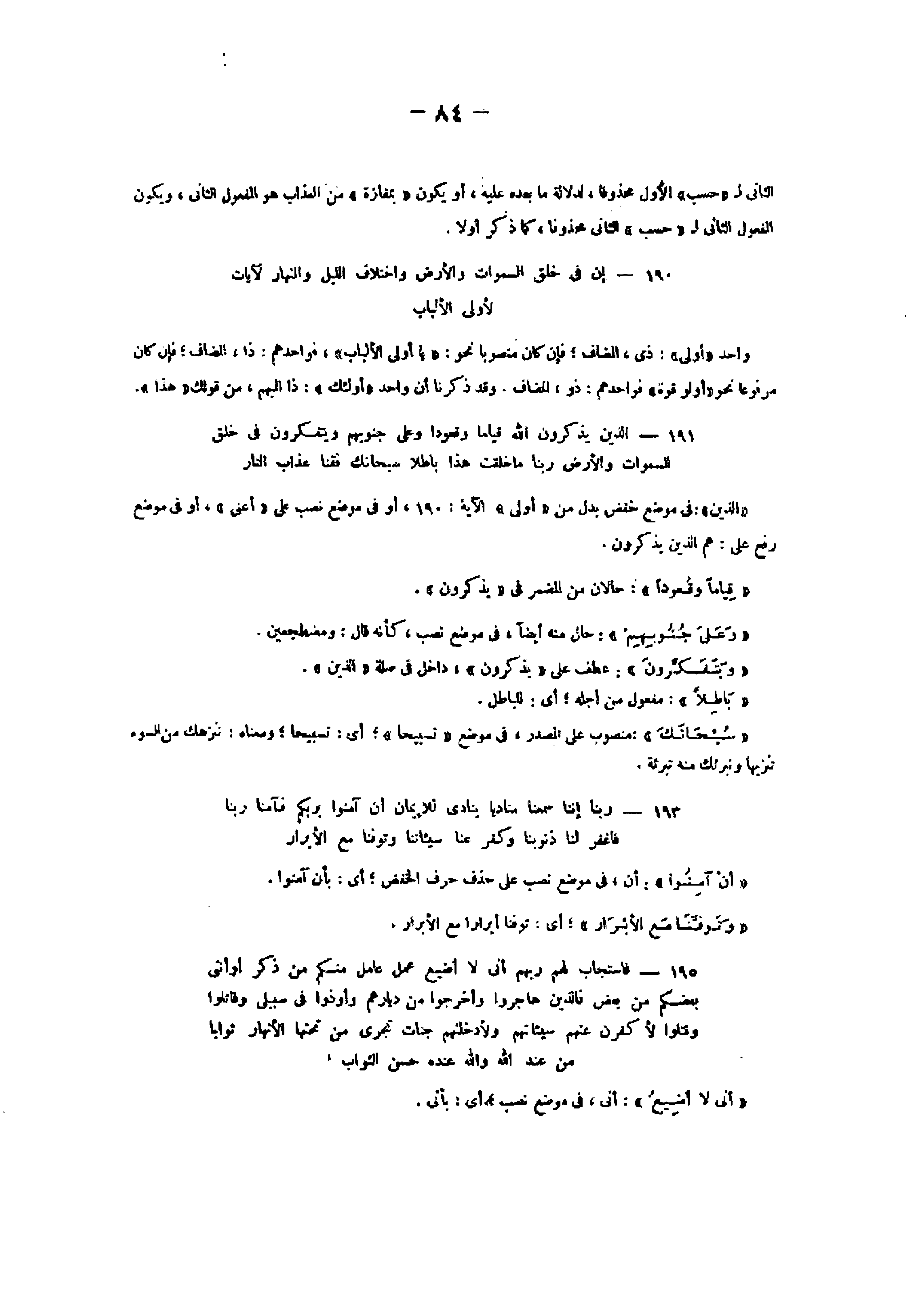 190- إِنَّ فِي خَلْقِ السَّماواتِ وَالْأَرْضِ وَاخْتِلافِ اللَّيْلِ وَالنَّهارِ لَآياتٍ لِأُولِي الْأَلْبابِ واحد «أولى» : ذى، المضاف فإن كان منصوبا نحو: «يا أولى الألباب» ، فواحدهم: ذا، المضاف فإن كان مرفوعا نحو «أولو قوة» فواحدهم: ذو، المضاف. وقد ذكرنا أن واحد «أولئك» : ذا المبهم، من قولك «هذا» .