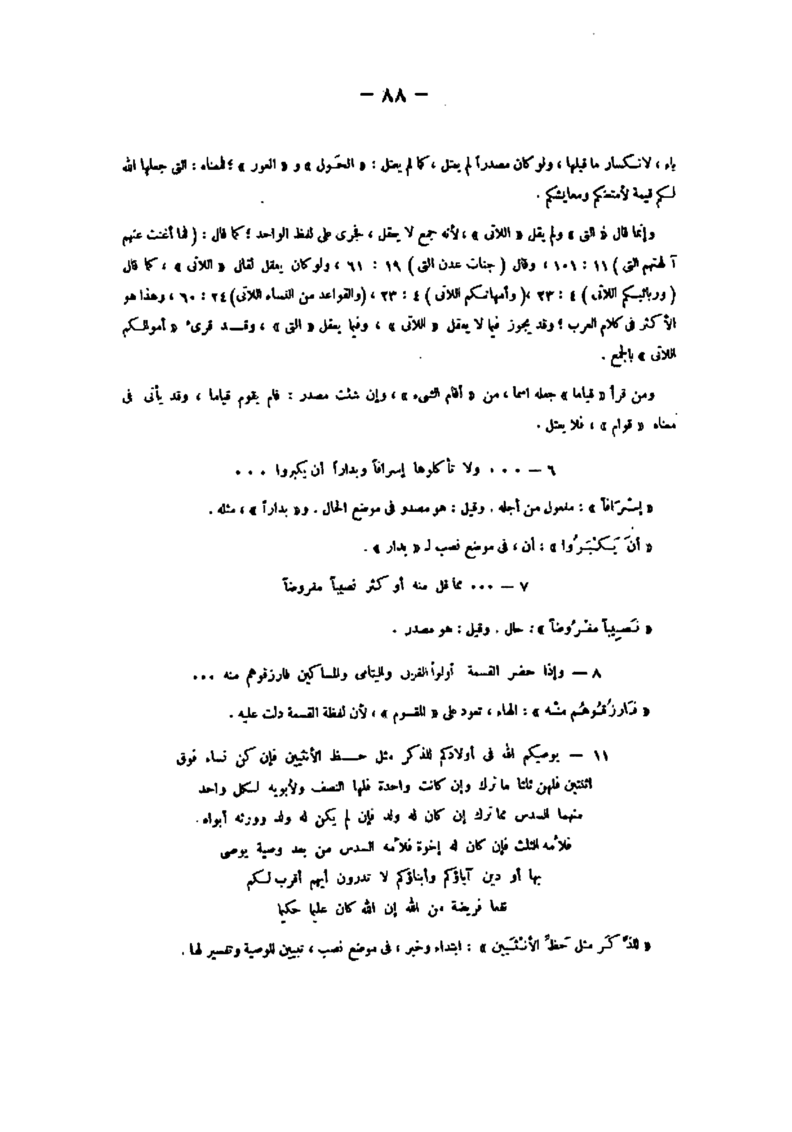 11- يُوصِيكُمُ اللَّهُ فِي أَوْلادِكُمْ لِلذَّكَرِ مِثْلُ حَظِّ الْأُنْثَيَيْنِ فَإِنْ كُنَّ نِساءً فَوْقَ اثْنَتَيْنِ فَلَهُنَّ ثُلُثا ما تَرَكَ وَإِنْ كانَتْ واحِدَةً فَلَهَا النِّصْفُ وَلِأَبَوَيْهِ لِكُلِّ واحِدٍ مِنْهُمَا السُّدُسُ مِمَّا تَرَكَ إِنْ كانَ لَهُ وَلَدٌ فَإِنْ لَمْ يَكُنْ لَهُ وَلَدٌ وَوَرِثَهُ أَبَواهُ. فَلِأُمِّهِ الثُّلُثُ فَإِنْ كانَ لَهُ إِخْوَةٌ فَلِأُمِّهِ السُّدُسُ مِنْ بَعْدِ وَصِيَّةٍ يُوصِي بِها أَوْ دَيْنٍ آباؤُكُمْ وَأَبْناؤُكُمْ لا تَدْرُونَ أَيُّهُمْ أَقْرَبُ لَكُمْ نَفْعاً فَرِيضَةً مِنَ اللَّهِ إِنَّ اللَّهَ كانَ عَلِيماً حَكِيماً «للذّكر مثل حظّ الأنثيين» : ابتداء وخبر، فى موضع نصب، تبيين للوصية وتفسير لها.