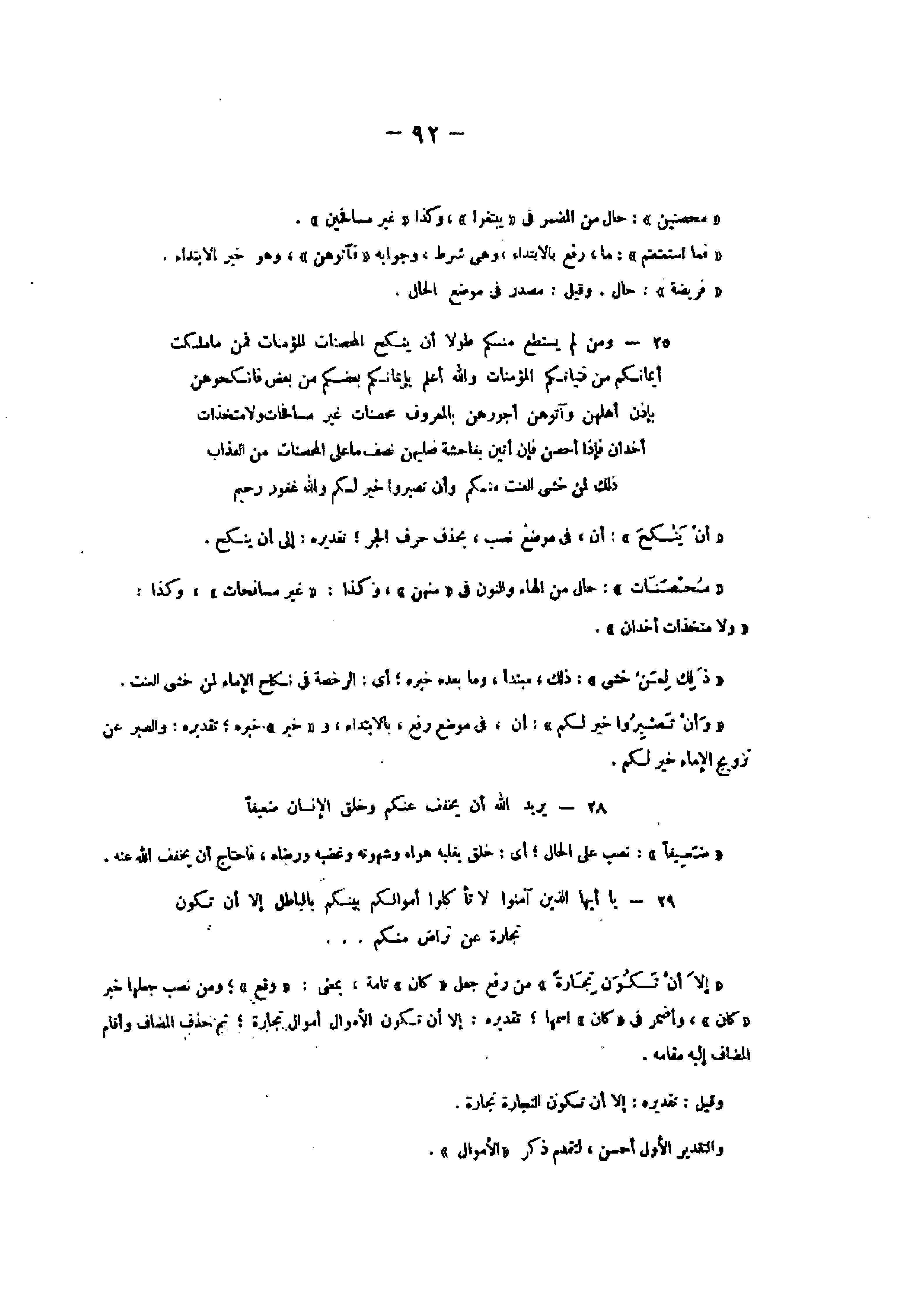 25- وَمَنْ لَمْ يَسْتَطِعْ مِنْكُمْ طَوْلًا أَنْ يَنْكِحَ الْمُحْصَناتِ الْمُؤْمِناتِ فَمِنْ ما مَلَكَتْ أَيْمانُكُمْ مِنْ فَتَياتِكُمُ الْمُؤْمِناتِ وَاللَّهُ أَعْلَمُ بِإِيمانِكُمْ بَعْضُكُمْ مِنْ بَعْضٍ فَانْكِحُوهُنَّ بِإِذْنِ أَهْلِهِنَّ وَآتُوهُنَّ أُجُورَهُنَّ بِالْمَعْرُوفِ مُحْصَناتٍ غَيْرَ مُسافِحاتٍ وَلا مُتَّخِذاتِ أَخْدانٍ فَإِذا أُحْصِنَّ فَإِنْ أَتَيْنَ بِفاحِشَةٍ فَعَلَيْهِنَّ نِصْفُ ما عَلَى الْمُحْصَناتِ مِنَ الْعَذابِ ذلِكَ لِمَنْ خَشِيَ الْعَنَتَ مِنْكُمْ وَأَنْ تَصْبِرُوا خَيْرٌ لَكُمْ وَاللَّهُ غَفُورٌ رَحِيمٌ «أن ينكح» : أن، فى موضع نصب، بحذف حرف الجر تقديره: إلى أن ينكح.