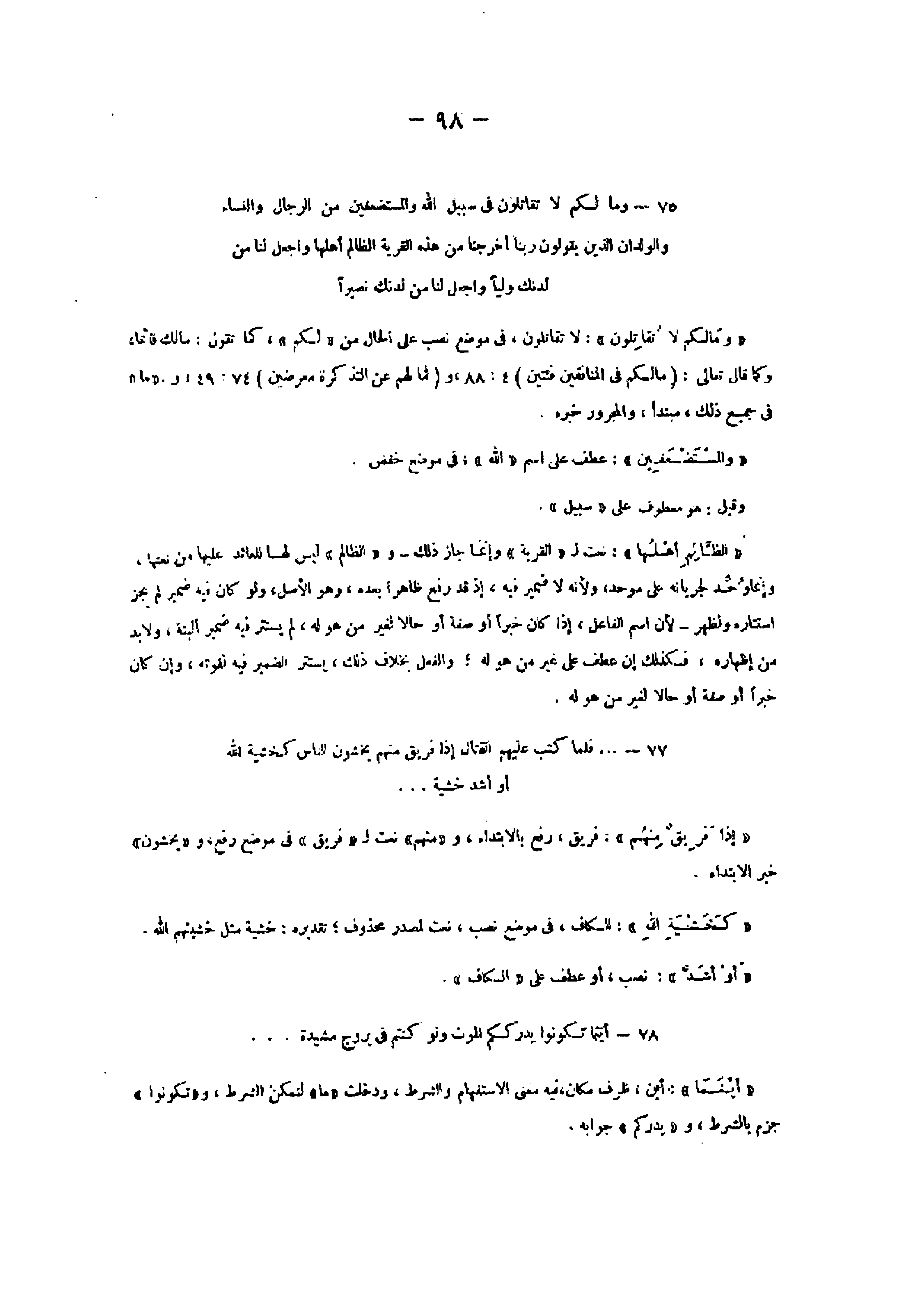 75- وَما لَكُمْ لا تُقاتِلُونَ فِي سَبِيلِ اللَّهِ وَالْمُسْتَضْعَفِينَ مِنَ الرِّجالِ وَالنِّساءِ وَالْوِلْدانِ الَّذِينَ يَقُولُونَ رَبَّنا أَخْرِجْنا مِنْ هذِهِ الْقَرْيَةِ الظَّالِمِ أَهْلُها وَاجْعَلْ لَنا مِنْ لَدُنْكَ وَلِيًّا وَاجْعَلْ لَنا مِنْ لَدُنْكَ نَصِيراً «وما لكم لا تقاتلون» : لا تقاتلون، فى موضع نصب على الحال من «لكم» ، كما تقول: مالك قائما، وكما قال تعالى: (فَما لَكُمْ فِي الْمُنافِقِينَ فِئَتَيْنِ) 4: 88، و (فَما لَهُمْ عَنِ التَّذْكِرَةِ مُعْرِضِينَ) 74: 49، و «ما» فى جميع ذلك، مبتدأ، والمجرور خبره.