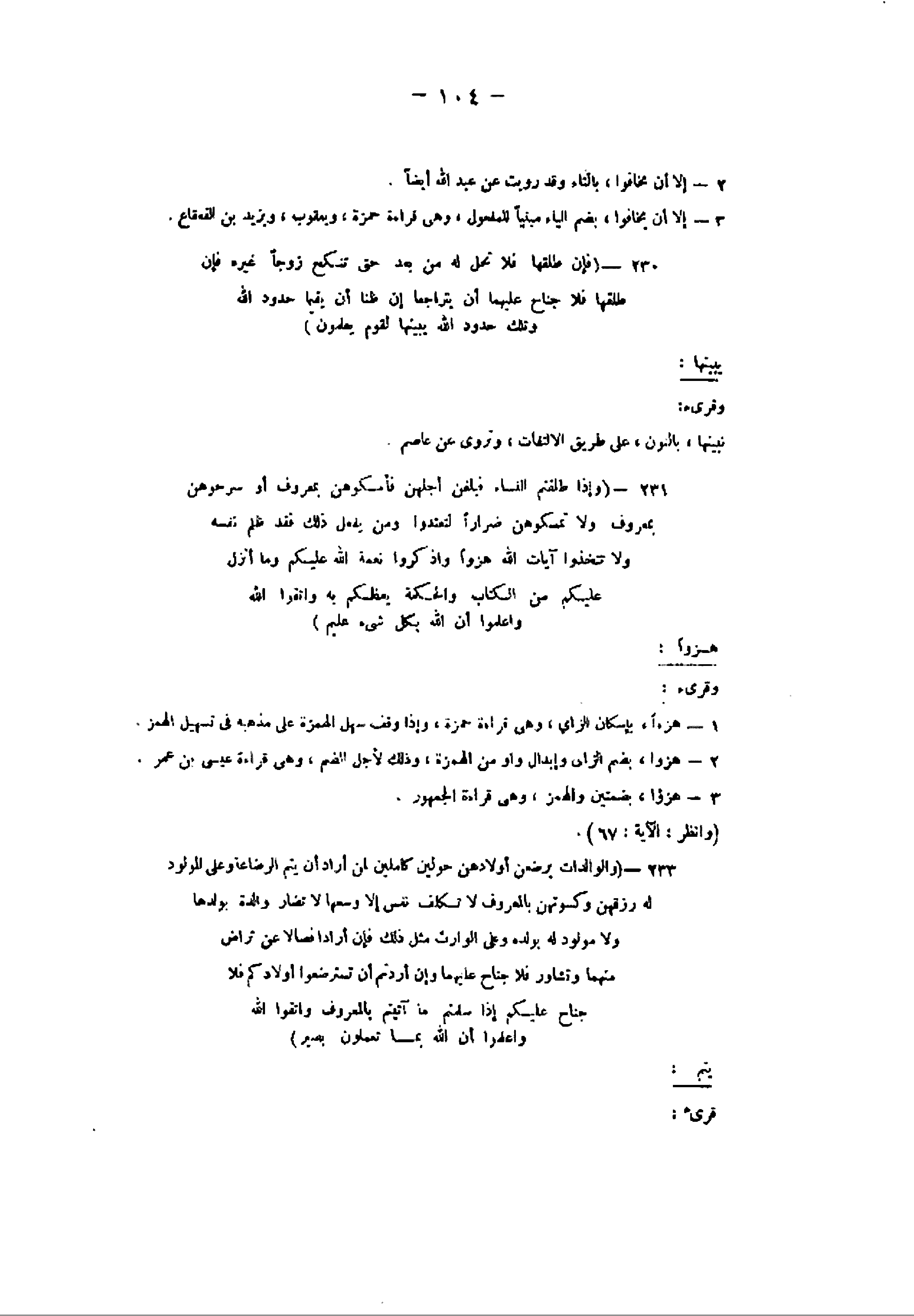 233- (وَالْوالِداتُ يُرْضِعْنَ أَوْلادَهُنَّ حَوْلَيْنِ كامِلَيْنِ لِمَنْ أَرادَ أَنْ يُتِمَّ الرَّضاعَةَ وَعَلَى الْمَوْلُودِ لَهُ رِزْقُهُنَّ وَكِسْوَتُهُنَّ بِالْمَعْرُوفِ لا تُكَلَّفُ نَفْسٌ إِلَّا وُسْعَها لا تُضَارَّ والِدَةٌ بِوَلَدِها وَلا مَوْلُودٌ لَهُ بِوَلَدِهِ وَعَلَى الْوارِثِ مِثْلُ ذلِكَ فَإِنْ أَرادا فِصالًا عَنْ تَراضٍ مِنْهُما وَتَشاوُرٍ فَلا جُناحَ عَلَيْهِما وَإِنْ أَرَدْتُمْ أَنْ تَسْتَرْضِعُوا أَوْلادَكُمْ فَلا جُناحَ عَلَيْكُمْ إِذا سَلَّمْتُمْ ما آتَيْتُمْ بِالْمَعْرُوفِ وَاتَّقُوا اللَّهَ وَاعْلَمُوا أَنَّ اللَّهَ بِما تَعْمَلُونَ بَصِيرٌ) يتم:
