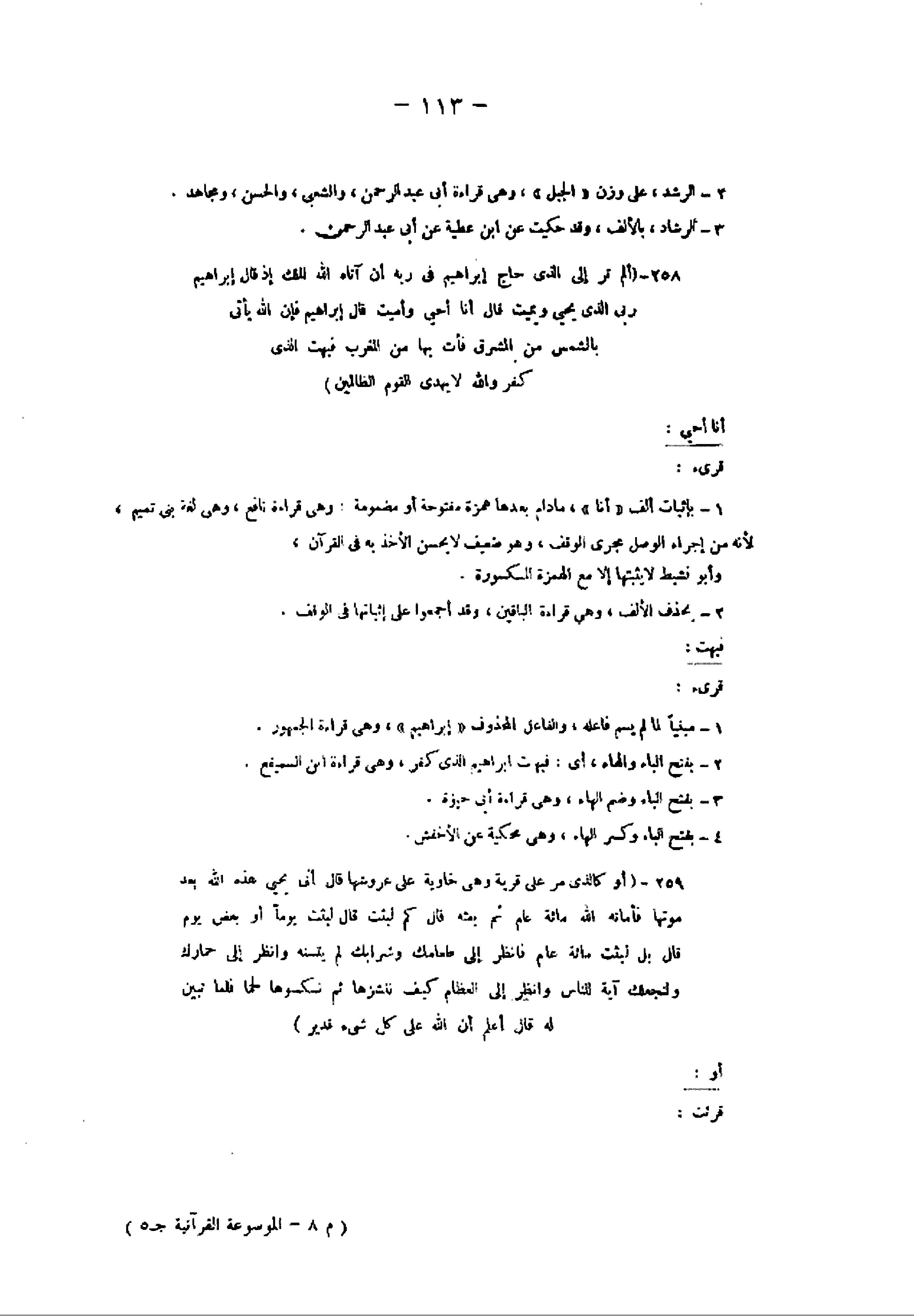 259- (أَوْ كَالَّذِي مَرَّ عَلى قَرْيَةٍ وَهِيَ خاوِيَةٌ عَلى عُرُوشِها قالَ أَنَّى يُحْيِي هذِهِ اللَّهُ بَعْدَ مَوْتِها فَأَماتَهُ اللَّهُ مِائَةَ عامٍ ثُمَّ بَعَثَهُ قالَ كَمْ لَبِثْتَ قالَ لَبِثْتُ يَوْماً أَوْ بَعْضَ يَوْمٍ قالَ بَلْ لَبِثْتَ مِائَةَ عامٍ فَانْظُرْ إِلى طَعامِكَ وَشَرابِكَ لَمْ يَتَسَنَّهْ وَانْظُرْ إِلى حِمارِكَ وَلِنَجْعَلَكَ آيَةً لِلنَّاسِ وَانْظُرْ إِلَى الْعِظامِ كَيْفَ نُنْشِزُها ثُمَّ نَكْسُوها لَحْماً فَلَمَّا تَبَيَّنَ لَهُ قالَ أَعْلَمُ أَنَّ اللَّهَ عَلى كُلِّ شَيْءٍ قَدِيرٌ) أو: