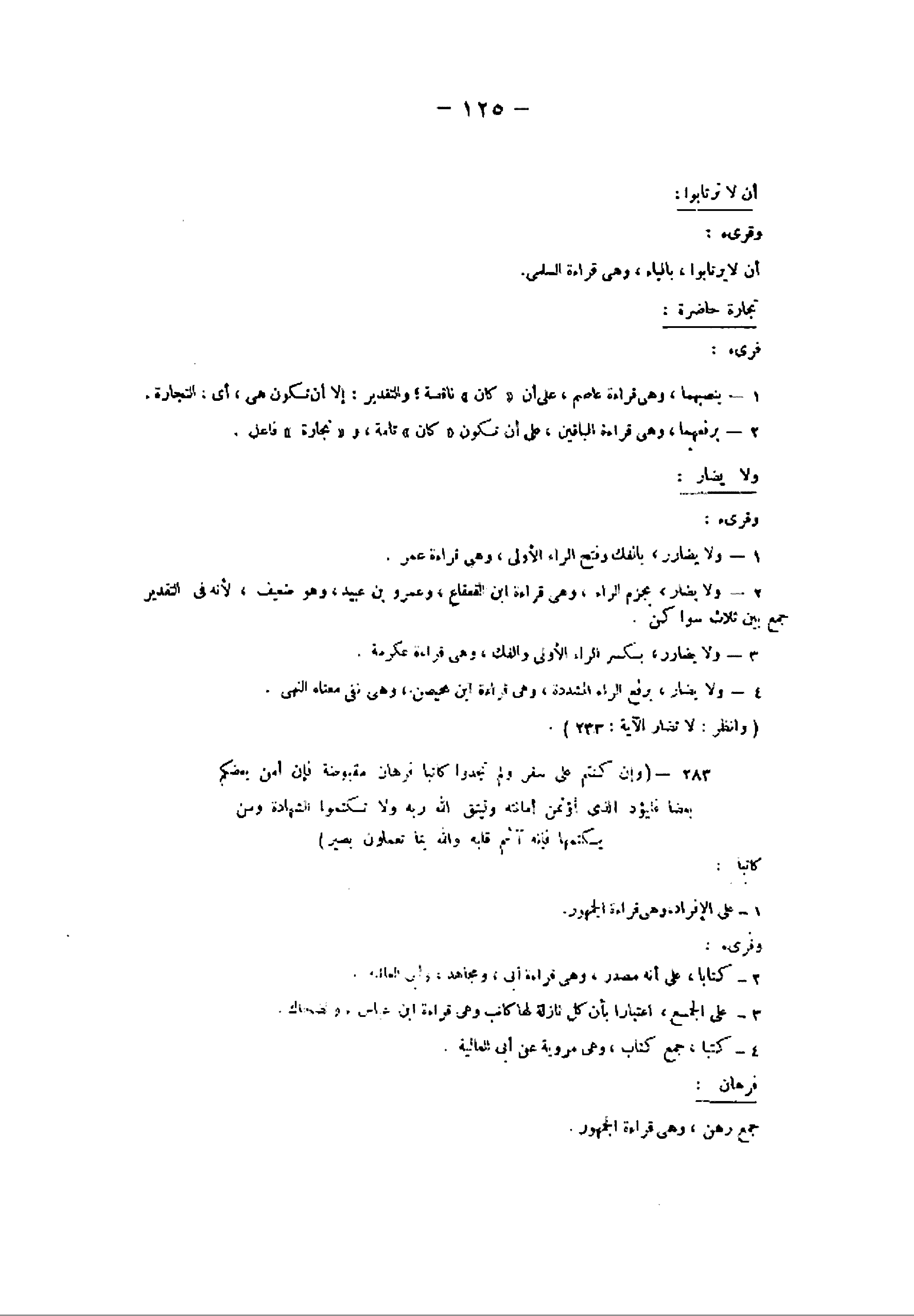 1- بنصبهما، وهى قراءة عاصم، على أن «كان» ناقصة والتقدير: إلا أن تكون هى، أي: التجارة.