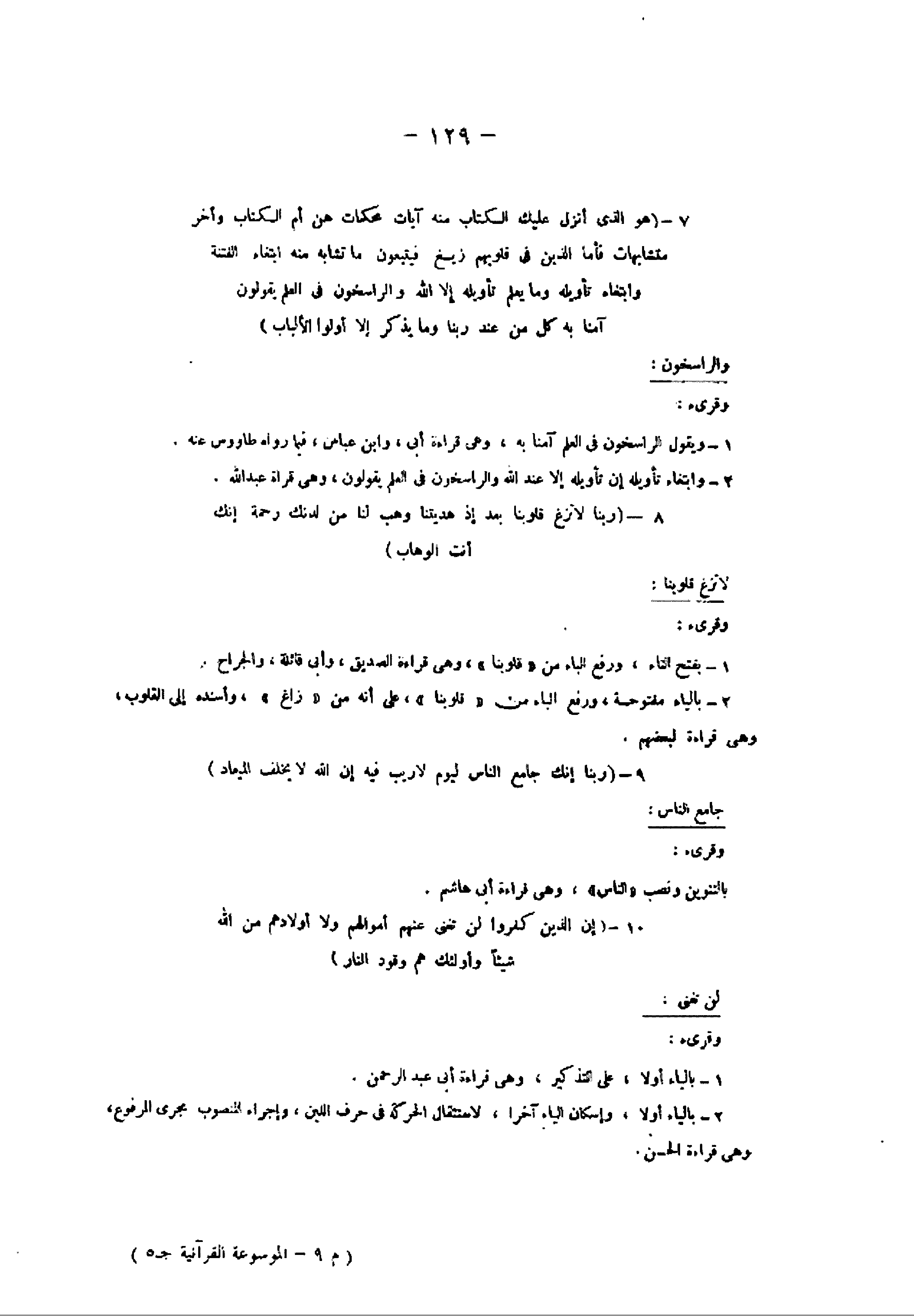 7- (هُوَ الَّذِي أَنْزَلَ عَلَيْكَ الْكِتابَ مِنْهُ آياتٌ مُحْكَماتٌ هُنَّ أُمُّ الْكِتابِ وَأُخَرُ مُتَشابِهاتٌ فَأَمَّا الَّذِينَ فِي قُلُوبِهِمْ زَيْغٌ فَيَتَّبِعُونَ ما تَشابَهَ مِنْهُ ابْتِغاءَ الْفِتْنَةِ وَابْتِغاءَ تَأْوِيلِهِ وَما يَعْلَمُ تَأْوِيلَهُ، إِلَّا اللَّهُ وَالرَّاسِخُونَ فِي الْعِلْمِ يَقُولُونَ آمَنَّا بِهِ كُلٌّ مِنْ عِنْدِ رَبِّنا وَما يَذَّكَّرُ إِلَّا أُولُوا الْأَلْبابِ) والراسخون: