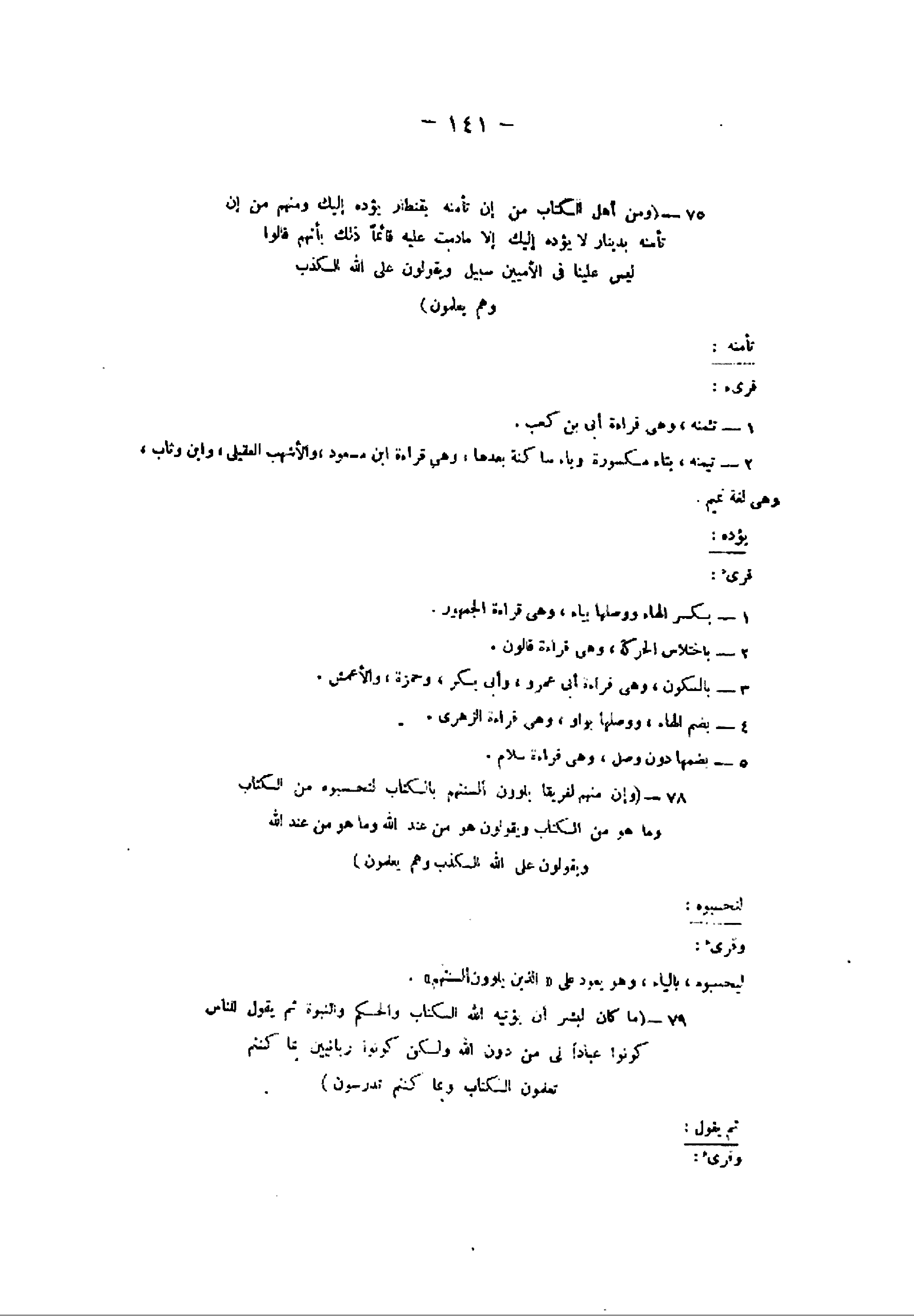 75- (وَمِنْ أَهْلِ الْكِتابِ مَنْ إِنْ تَأْمَنْهُ بِقِنْطارٍ يُؤَدِّهِ إِلَيْكَ وَمِنْهُمْ مَنْ إِنْ تَأْمَنْهُ بِدِينارٍ لا يُؤَدِّهِ إِلَيْكَ إِلَّا ما دُمْتَ عَلَيْهِ قائِماً ذلِكَ بِأَنَّهُمْ قالُوا لَيْسَ عَلَيْنا فِي الْأُمِّيِّينَ سَبِيلٌ وَيَقُولُونَ عَلَى اللَّهِ الْكَذِبَ وَهُمْ يَعْلَمُونَ) تأمنه: