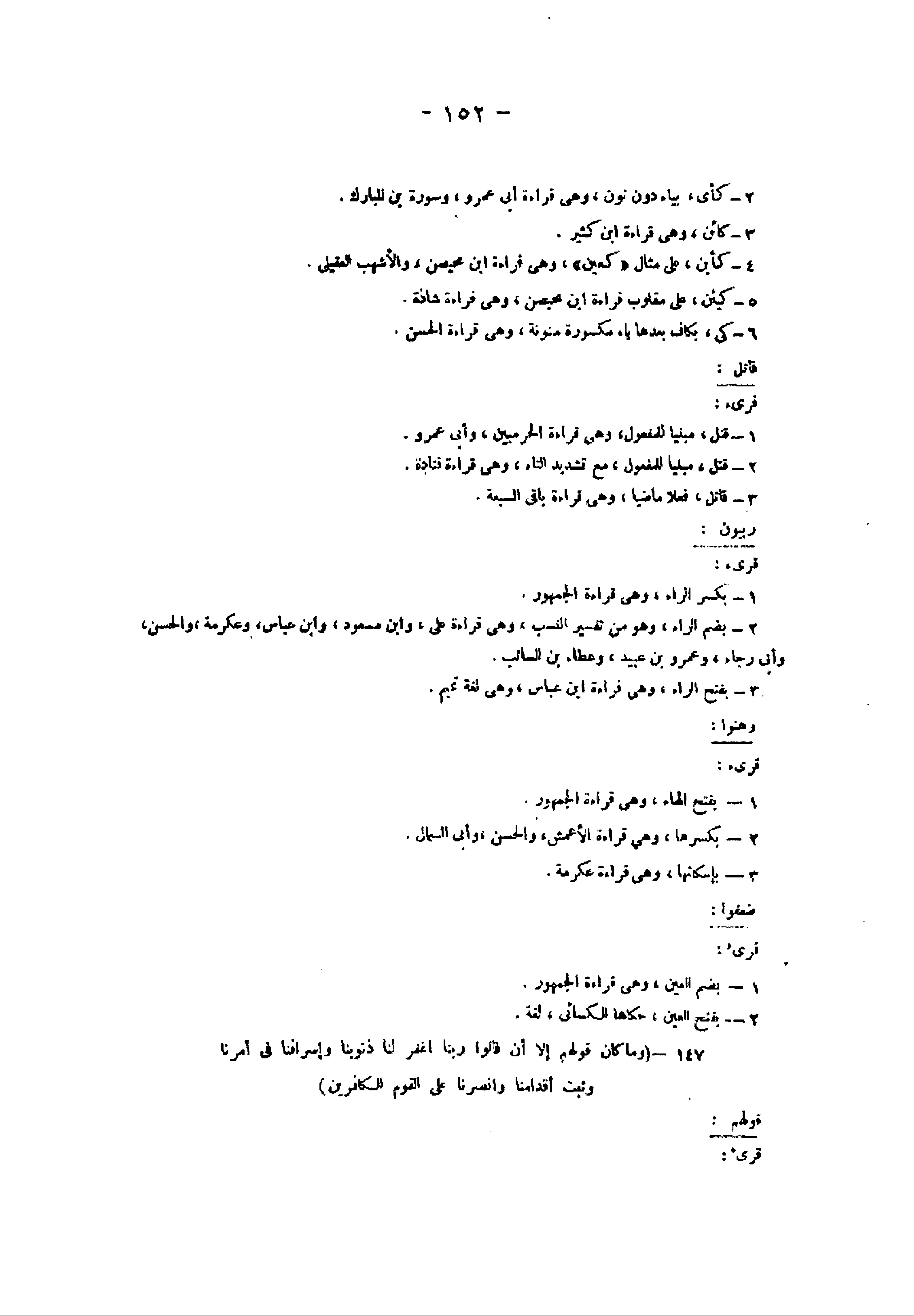 1- قتل، مبنيا للمفعول، وهى قراءة الحرميين، وأبى عمرو.