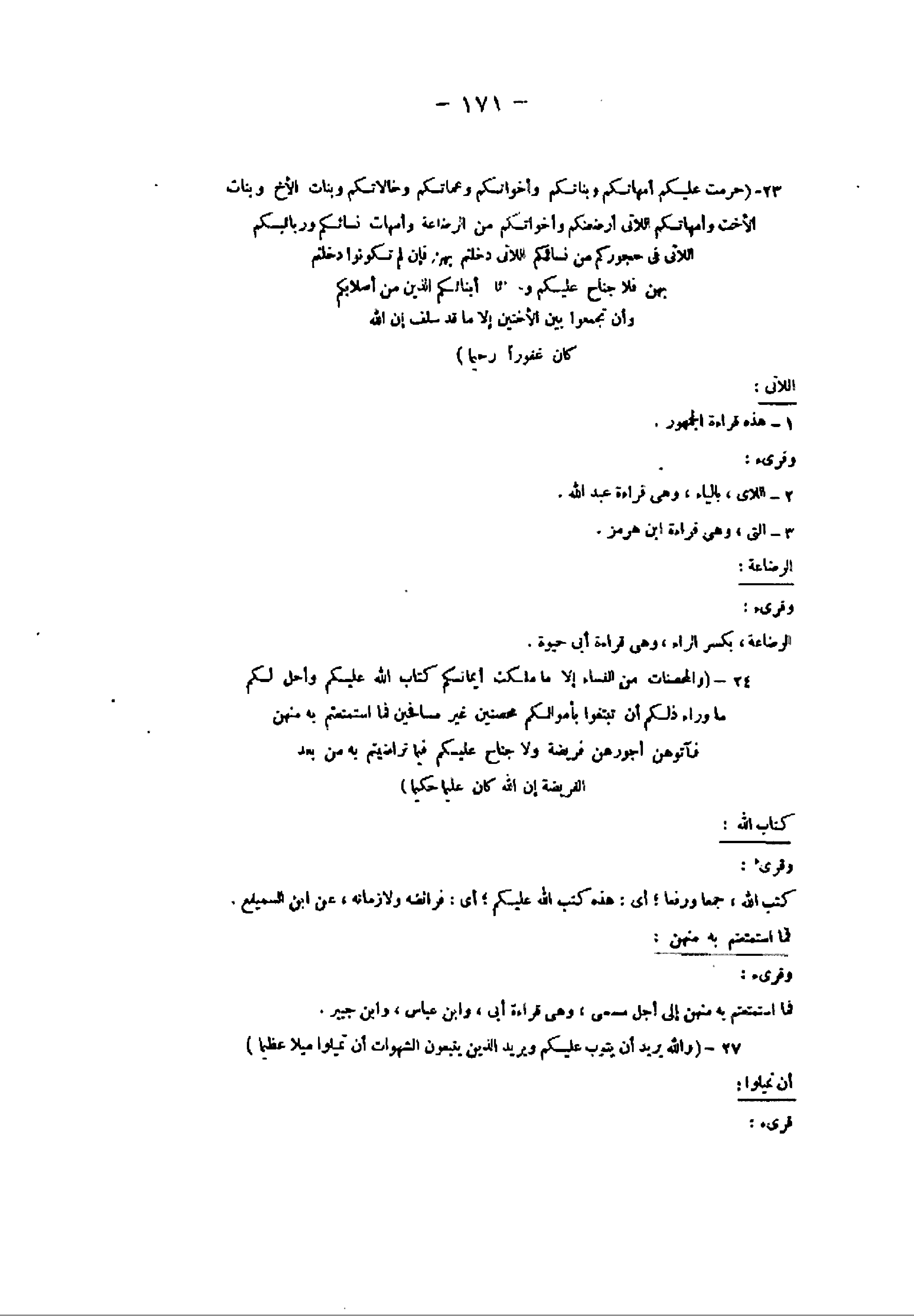 24- (وَالْمُحْصَناتُ مِنَ النِّساءِ إِلَّا ما مَلَكَتْ أَيْمانُكُمْ كِتابَ اللَّهِ عَلَيْكُمْ وَأُحِلَّ لَكُمْ ما وَراءَ ذلِكُمْ أَنْ تَبْتَغُوا بِأَمْوالِكُمْ مُحْصِنِينَ غَيْرَ مُسافِحِينَ فَمَا اسْتَمْتَعْتُمْ بِهِ مِنْهُنَّ فَآتُوهُنَّ أُجُورَهُنَّ فَرِيضَةً وَلا جُناحَ عَلَيْكُمْ فِيما تَراضَيْتُمْ بِهِ مِنْ بَعْدِ الْفَرِيضَةِ إِنَّ اللَّهَ كانَ عَلِيماً حَكِيماً) كتاب الله: