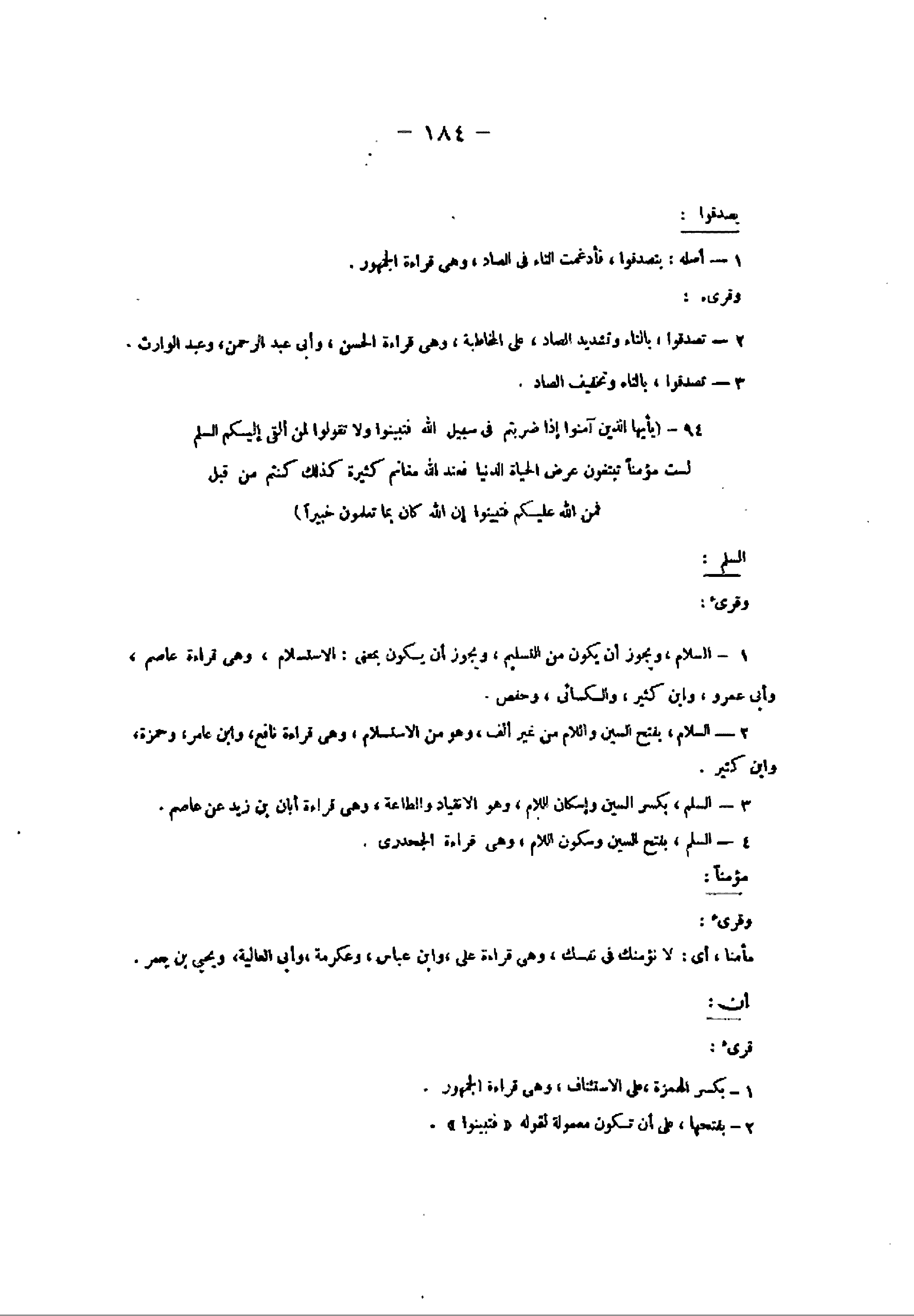 1- السلام، ويجوز أن يكون من التسليم، ويجوز أن يكون بمعنى: الاستسلام، وهى قراءة عاصم، وأبى عمرو، وابن كثير، والكسائي، وحفص.