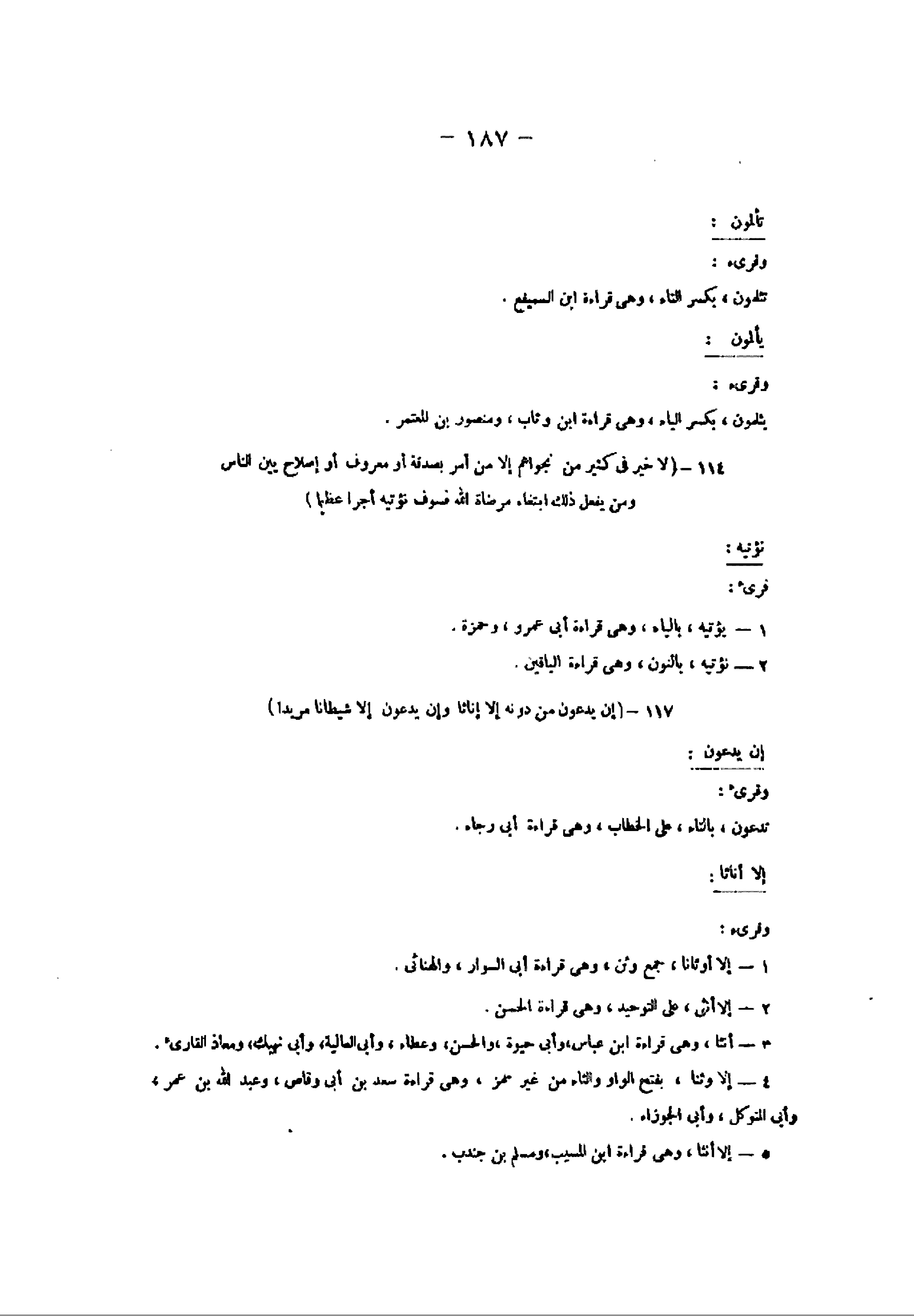 114- (لا خَيْرَ فِي كَثِيرٍ مِنْ نَجْواهُمْ إِلَّا مَنْ أَمَرَ بِصَدَقَةٍ أَوْ مَعْرُوفٍ أَوْ إِصْلاحٍ بَيْنَ النَّاسِ وَمَنْ يَفْعَلْ ذلِكَ ابْتِغاءَ مَرْضاتِ اللَّهِ فَسَوْفَ نُؤْتِيهِ أَجْراً عَظِيماً) نؤتيه: