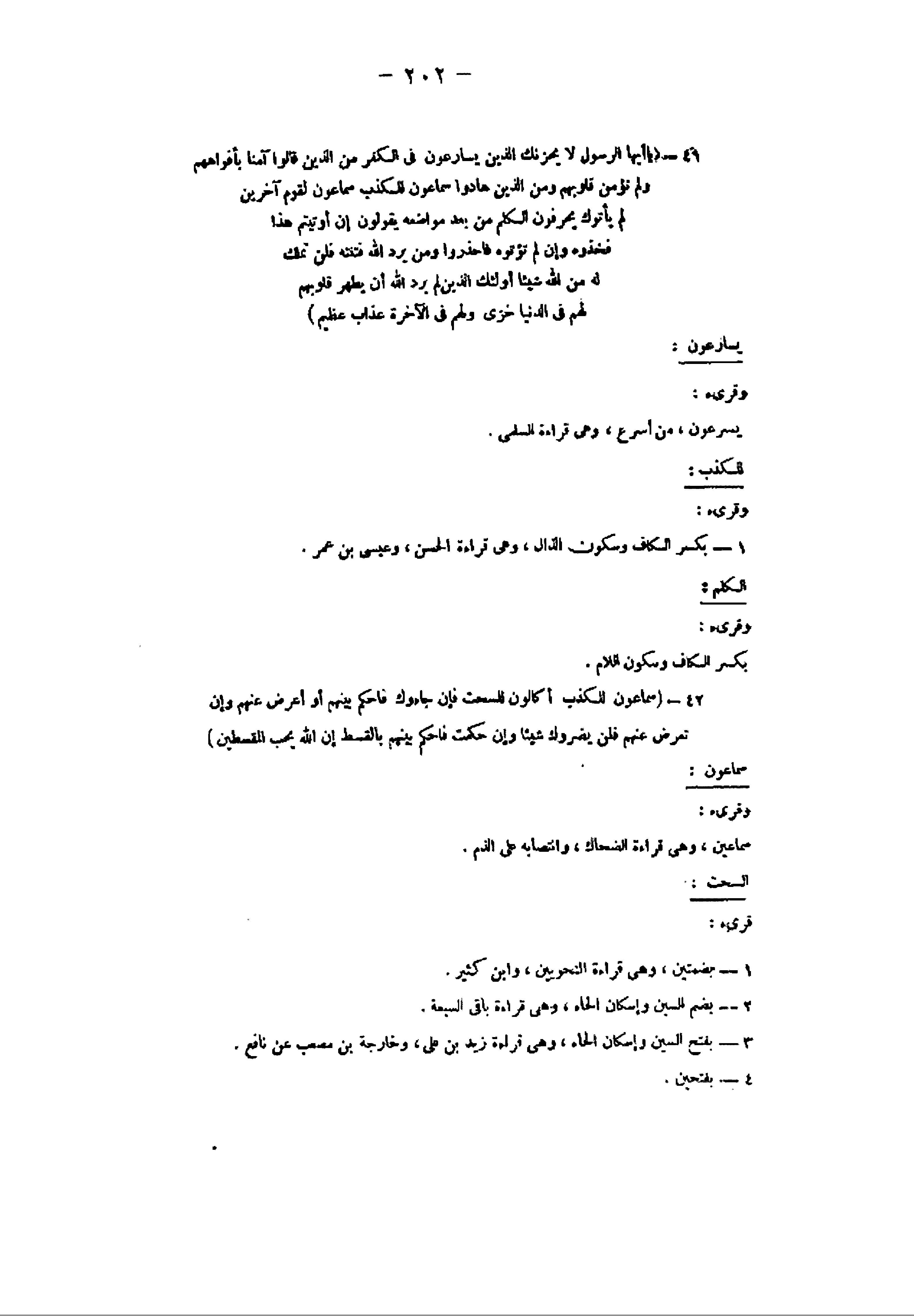 41- (يا أَيُّهَا الرَّسُولُ لا يَحْزُنْكَ الَّذِينَ يُسارِعُونَ فِي الْكُفْرِ مِنَ الَّذِينَ قالُوا آمَنَّا بِأَفْواهِهِمْ وَلَمْ تُؤْمِنْ قُلُوبُهُمْ وَمِنَ الَّذِينَ هادُوا سَمَّاعُونَ لِلْكَذِبِ سَمَّاعُونَ لِقَوْمٍ آخَرِينَ لَمْ يَأْتُوكَ يُحَرِّفُونَ الْكَلِمَ مِنْ بَعْدِ مَواضِعِهِ يَقُولُونَ إِنْ أُوتِيتُمْ هذا فَخُذُوهُ وَإِنْ لَمْ تُؤْتَوْهُ فَاحْذَرُوا وَمَنْ يُرِدِ اللَّهُ فِتْنَتَهُ فَلَنْ تَمْلِكَ لَهُ مِنَ اللَّهِ شَيْئاً أُولئِكَ الَّذِينَ لَمْ يُرِدِ اللَّهُ أَنْ يُطَهِّرَ قُلُوبَهُمْ لَهُمْ فِي الدُّنْيا خِزْيٌ وَلَهُمْ فِي الْآخِرَةِ عَذابٌ عَظِيمٌ) يسارعون: