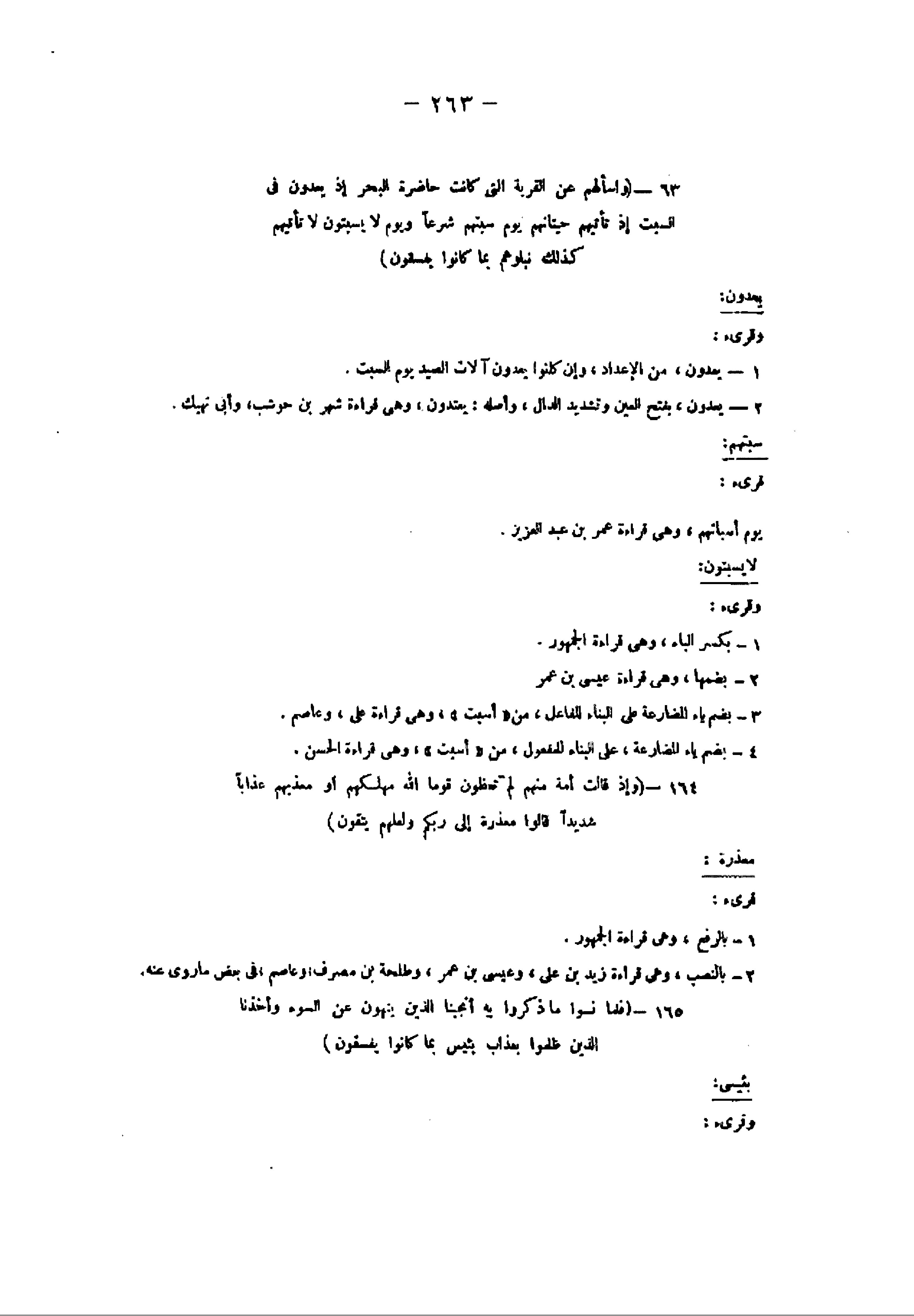 163- (وَسْئَلْهُمْ عَنِ الْقَرْيَةِ الَّتِي كانَتْ حاضِرَةَ الْبَحْرِ إِذْ يَعْدُونَ فِي السَّبْتِ إِذْ تَأْتِيهِمْ حِيتانُهُمْ يَوْمَ سَبْتِهِمْ شُرَّعاً وَيَوْمَ لا يَسْبِتُونَ لا تَأْتِيهِمْ كَذلِكَ نَبْلُوهُمْ بِما كانُوا يَفْسُقُونَ) يعدون: