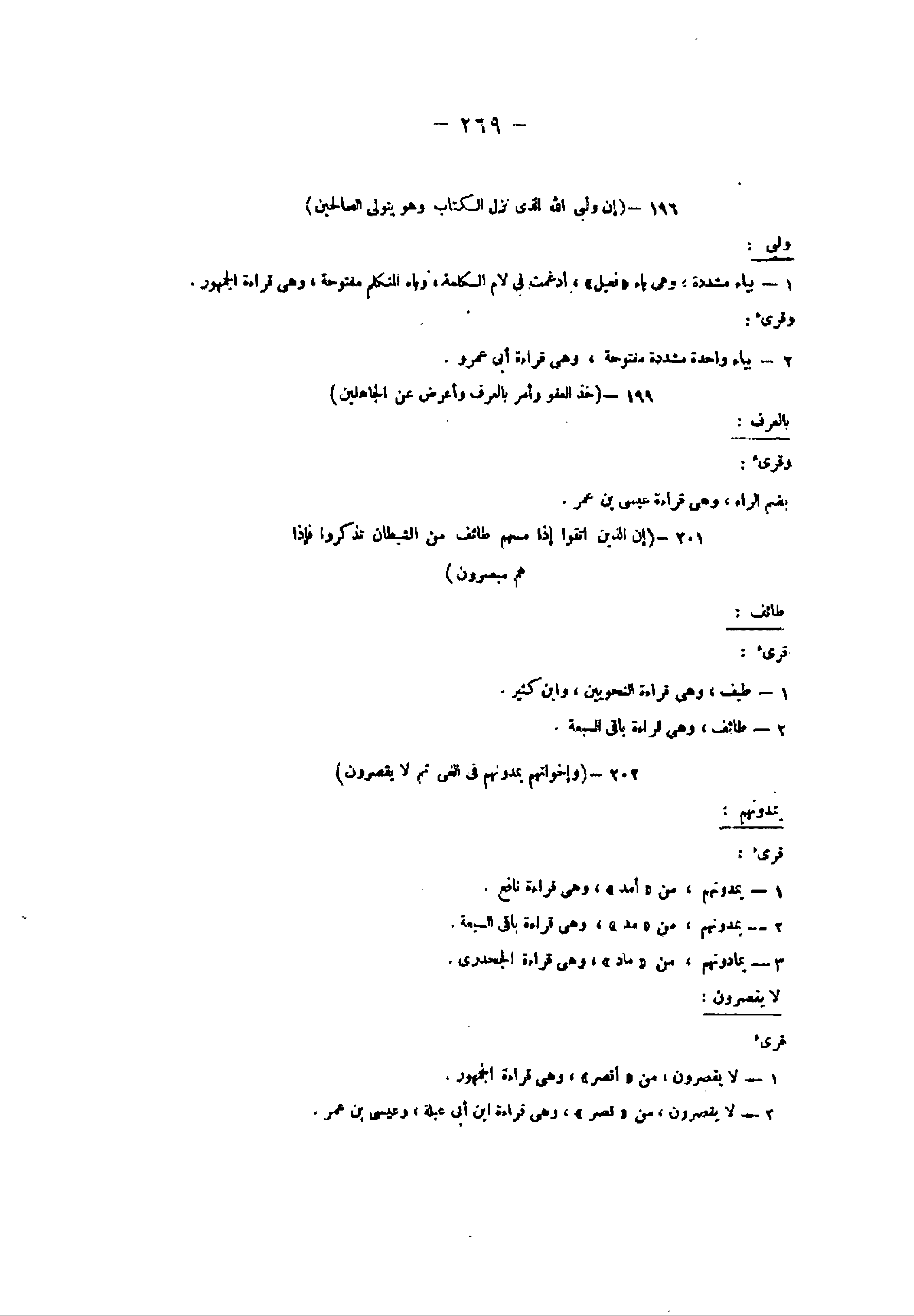 196- (إِنَّ وَلِيِّيَ اللَّهُ الَّذِي نَزَّلَ الْكِتابَ وَهُوَ يَتَوَلَّى الصَّالِحِينَ) ولى: