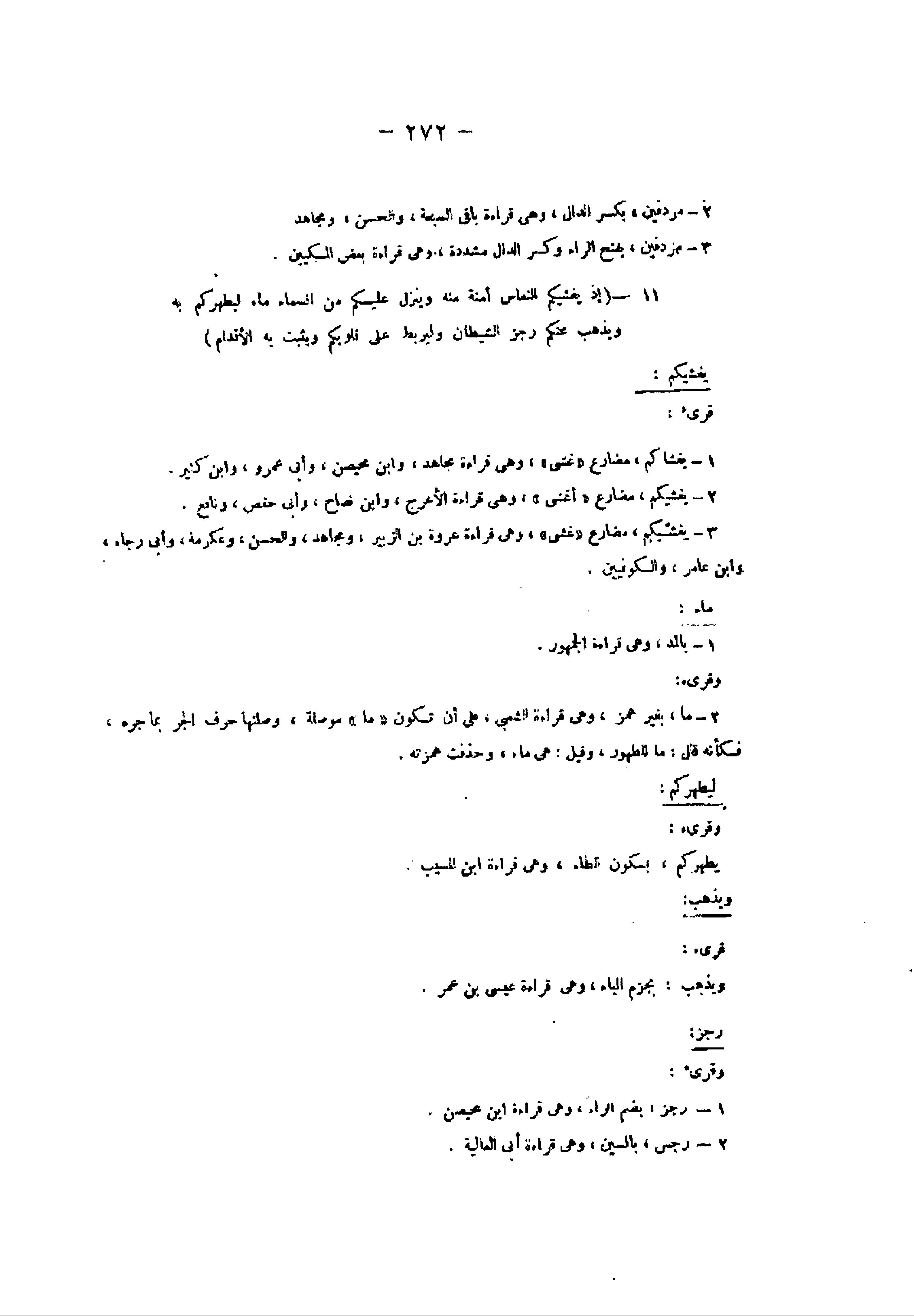 3- يغشّيكم، مضارع «غشى» ، وهى قراءة عروة بن الزبير، ومجاهد، والحسن، وعكرمة، وأبى رجاء، وابن عامر، والكوفيين.
