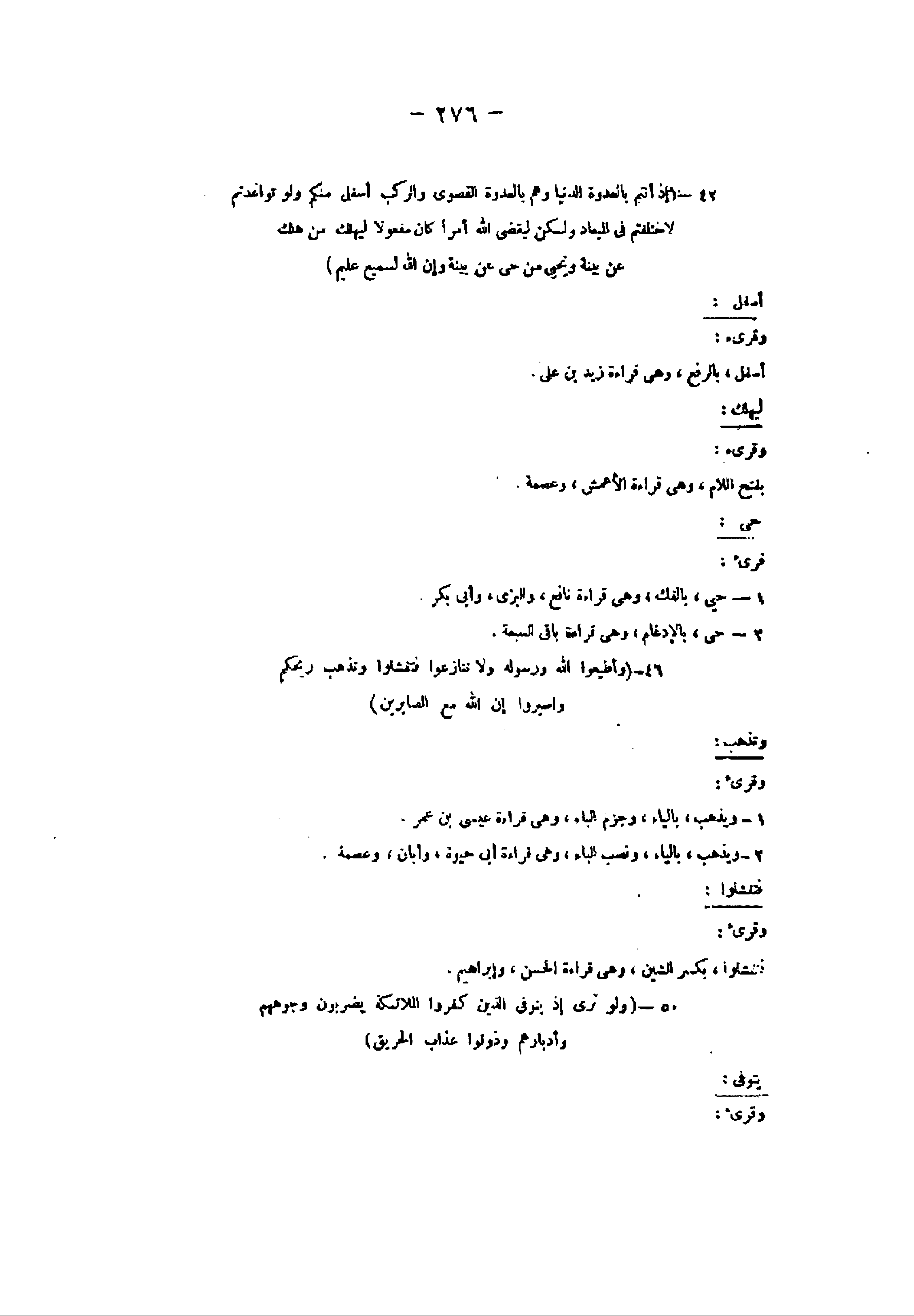 50- (وَلَوْ تَرى إِذْ يَتَوَفَّى الَّذِينَ كَفَرُوا الْمَلائِكَةُ يَضْرِبُونَ وُجُوهَهُمْ وَأَدْبارَهُمْ وَذُوقُوا عَذابَ الْحَرِيقِ) يتوفى: