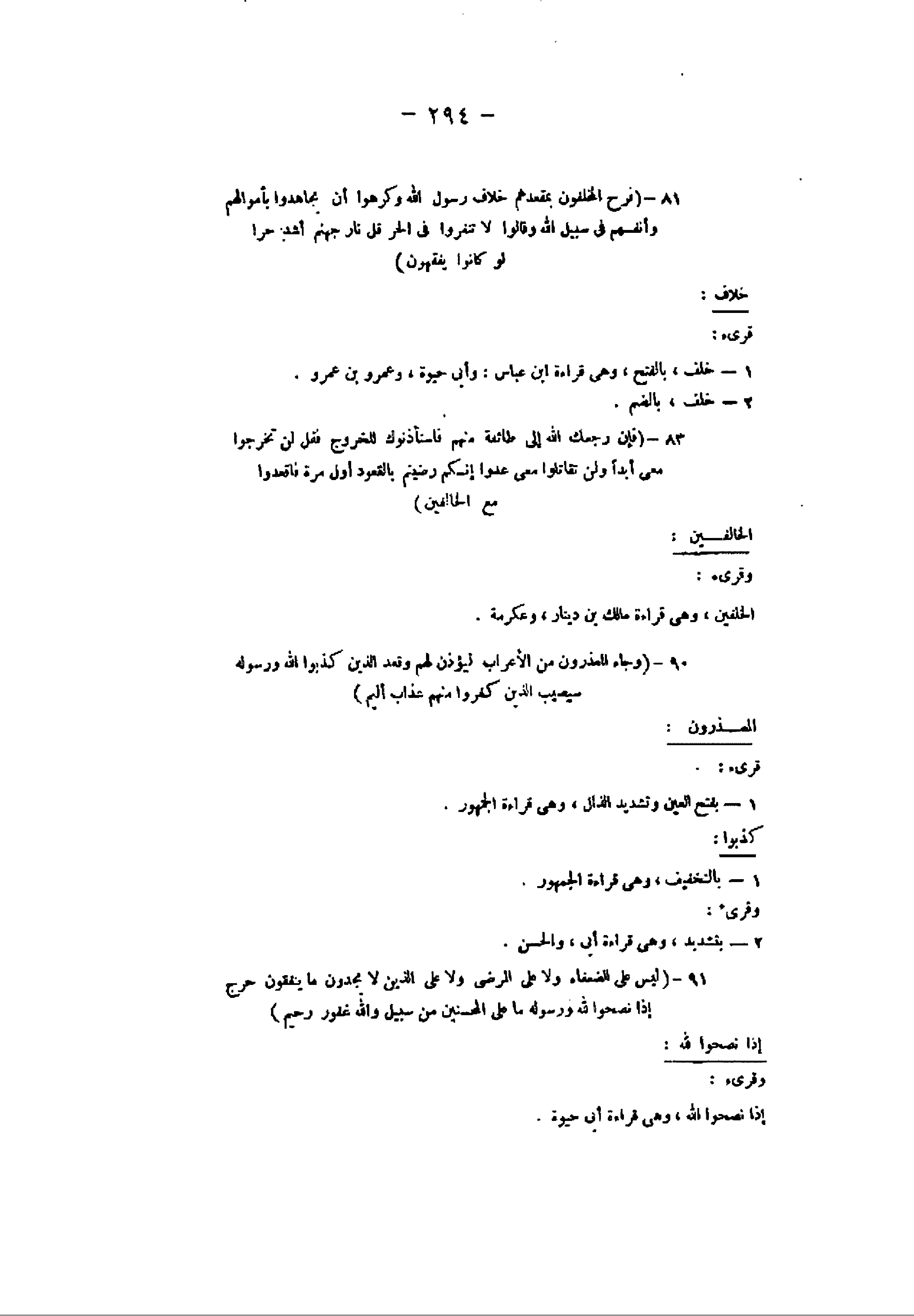 90- (وَجاءَ الْمُعَذِّرُونَ مِنَ الْأَعْرابِ لِيُؤْذَنَ لَهُمْ وَقَعَدَ الَّذِينَ كَذَبُوا اللَّهَ وَرَسُولَهُ سَيُصِيبُ الَّذِينَ كَفَرُوا مِنْهُمْ عَذابٌ أَلِيمٌ) المعذرون: